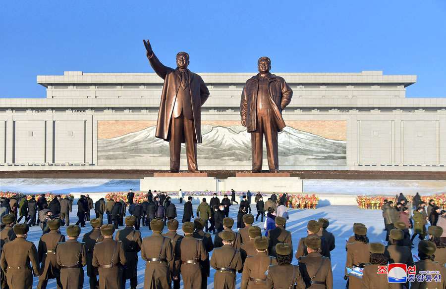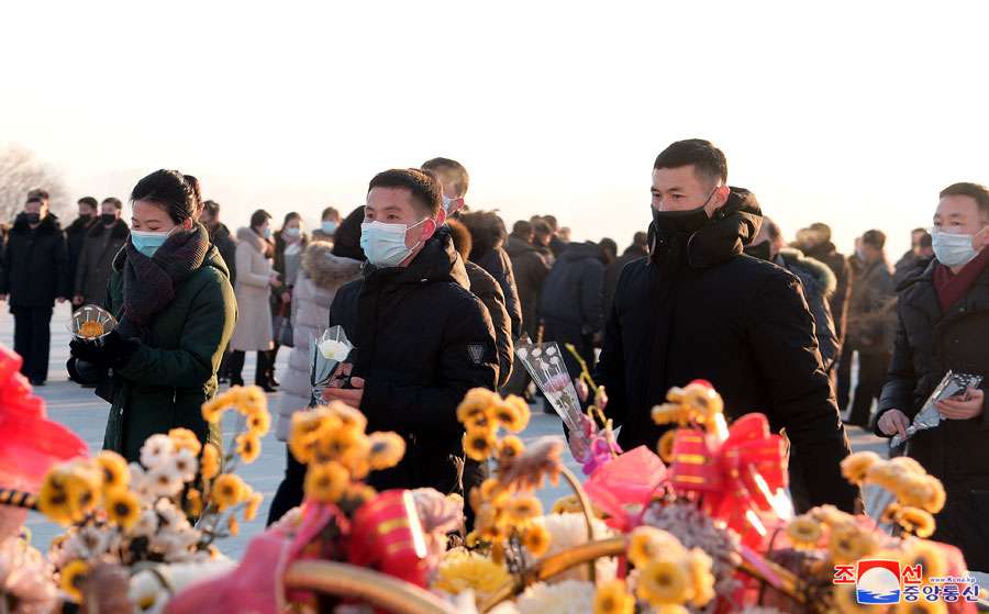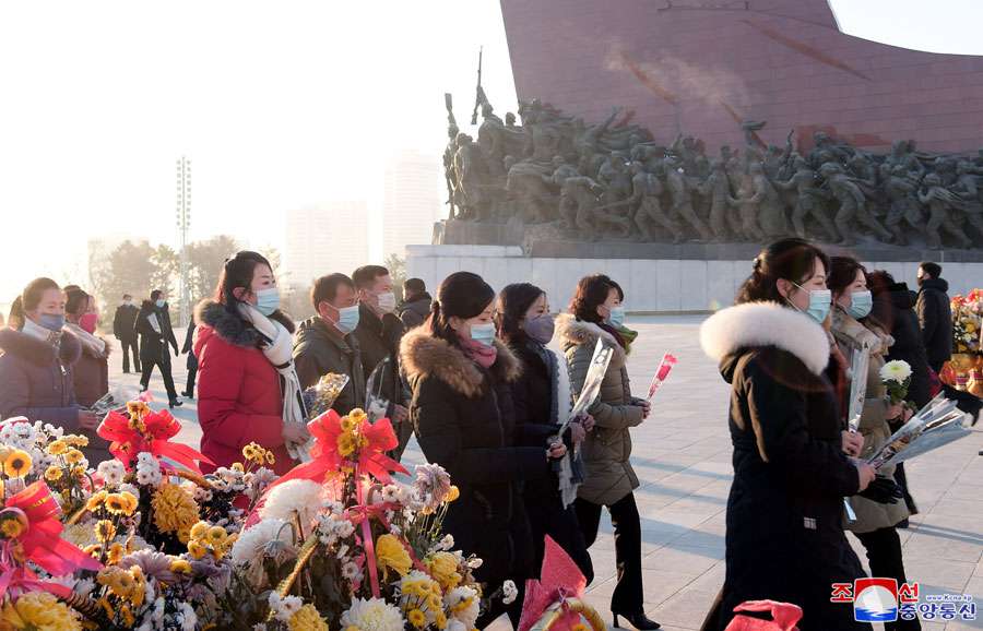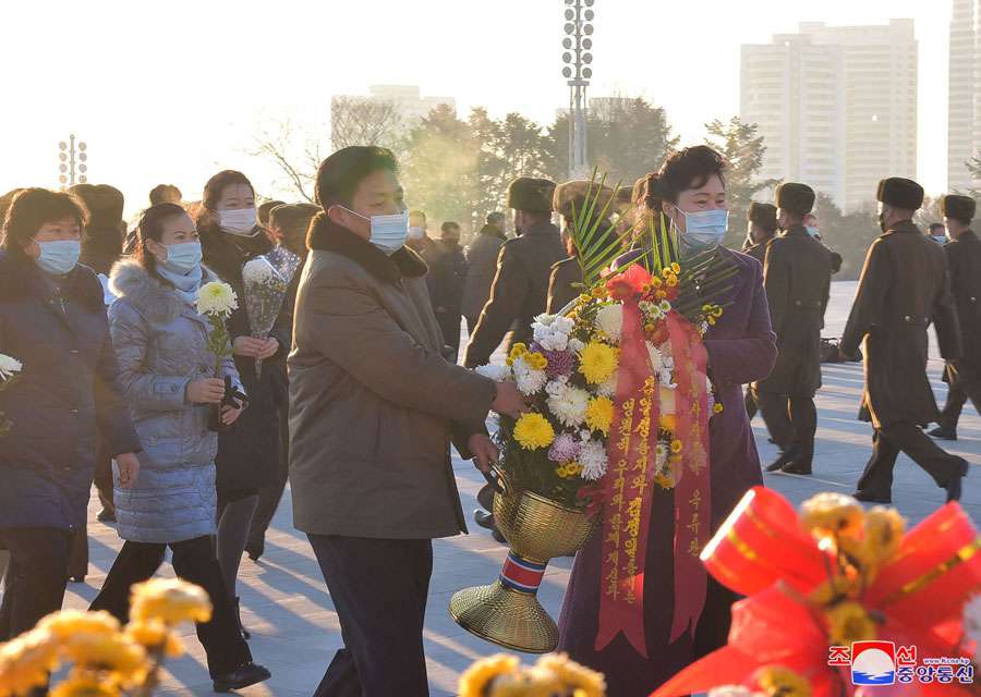 Pchjongjang, 17. prosince čučche 109 (2020) (KCNA) – U příležitosti 9. výročí úmrtí velkého vůdce soudruha Kim Čong Ila funkcionáři, pracující a sloužící mužstvo lidové armády položili květinové koše a kytice květin k bronzovým sochám a portrétům slunečně usměvavých vynikajících velikánů na různých místech.