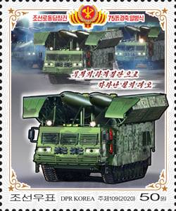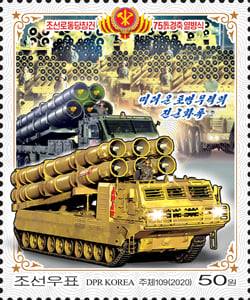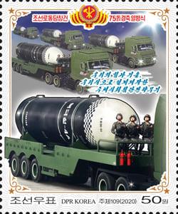 Poštovní známky zachycující vojenskou přehlídku pořádanou 10. 10. čučche 109 (2020) k 75. výročí založení slavné Korejské strany práce.