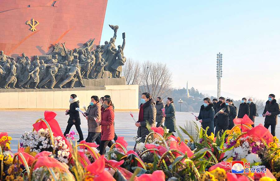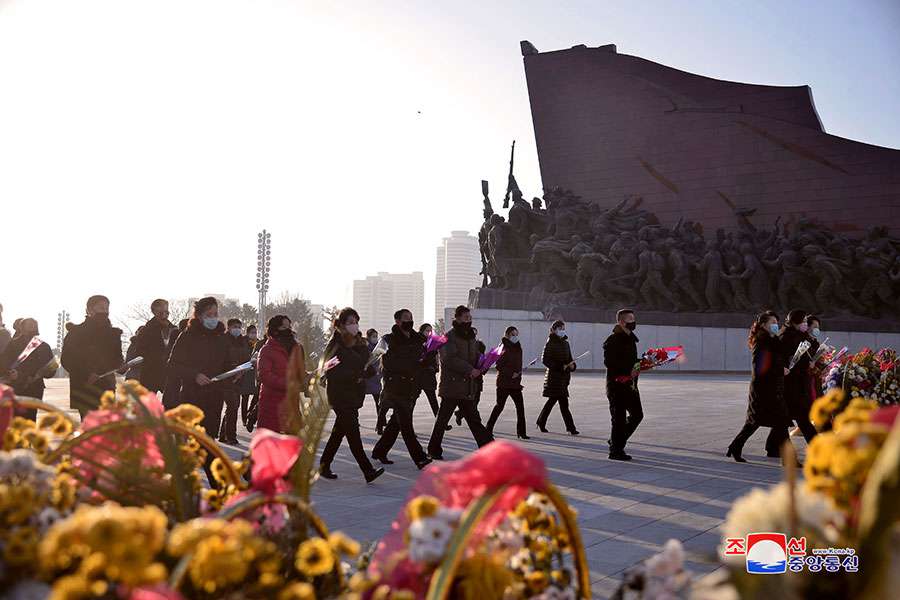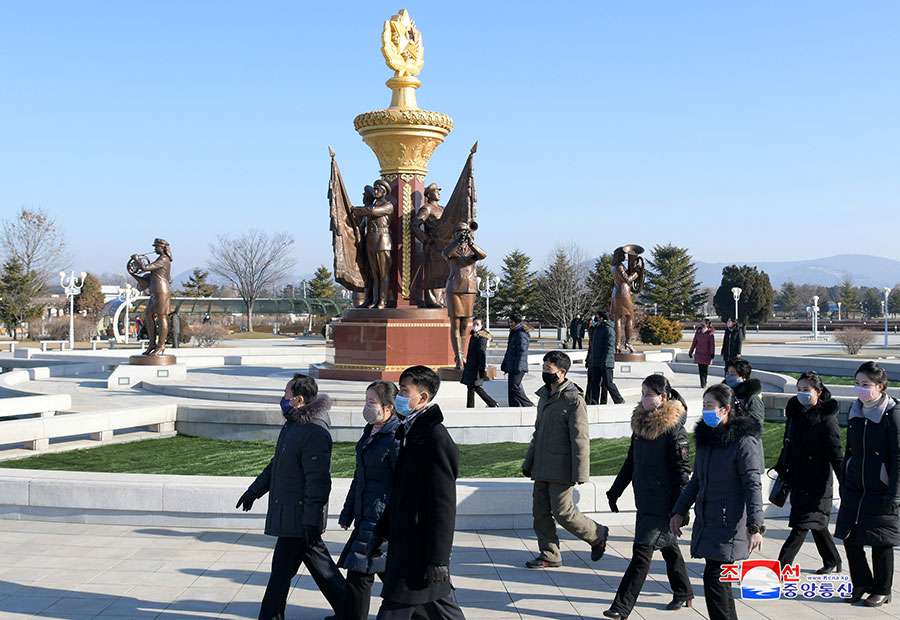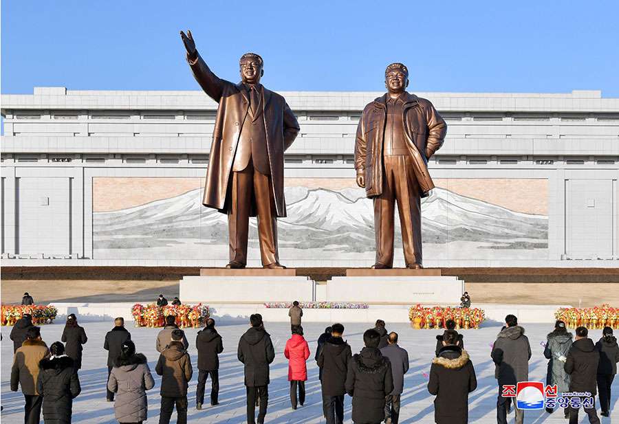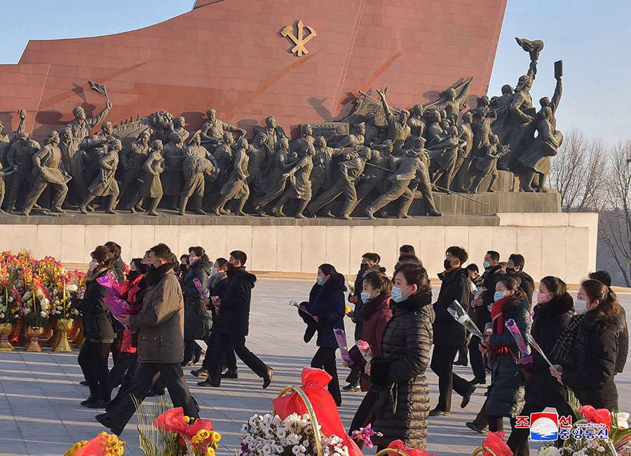 Pchjongjang, 1. ledna čučche 110 (2021) (KCNA) – Ráno prvního dne nového roku, plného naděje, navštívili funkcionáři, pracující a sloužící mužstvo lidové armády bronzové sochy a portréty slunečně usměvavých velkých vůdců soudruhů Kim Ir Sena a Kim Čong Ila na různých místech a vyjádřili jim hlubokou úctu.
