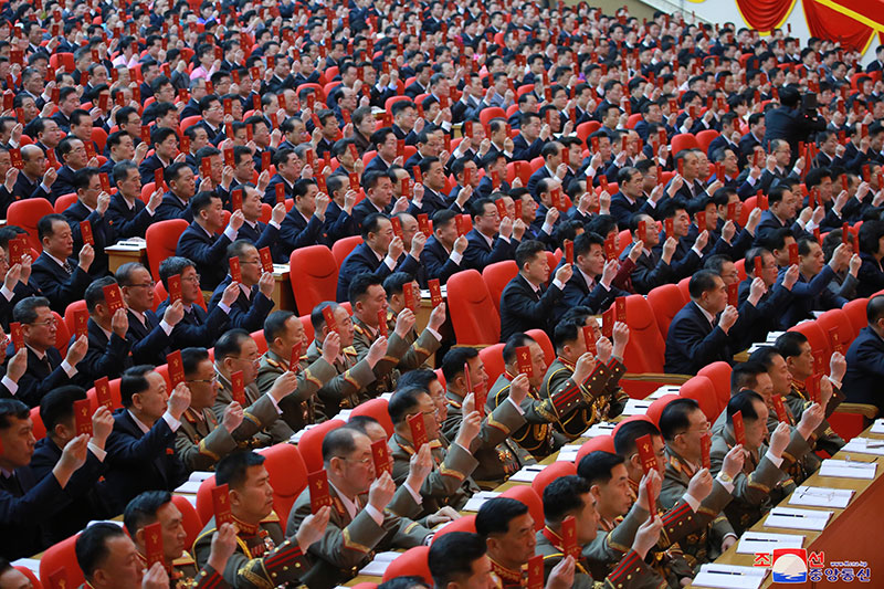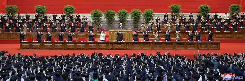 V tu chvíli všichni účastníci, naplněni vzrušením a radostí z opětovného zvolení váženého soudruha Kim Čong Una, který se skvělou ideologickou a teoretickou moudrostí, výjimečným uměním vedení a ušlechtilou morálkou otevírá éru bezpříkladných grandiózních změn a zázraků, do čela Korejské strany práce, propukli v bouřlivý jásot „Hurá“ a vyjádřili mu nejvyšší slávu a nejvřelejší gratulace.