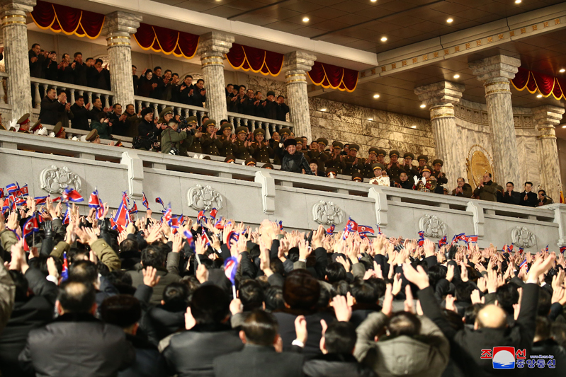 Na pódium se dostavil generální tajemník Korejské strany práce, předseda Komise pro státní záležitosti Korejské lidově demokratické republiky, vrchní velitel ozbrojených sil KLDR soudruh Kim Čong Un. Výkřiky „Hurá!“, „Kim Čong Un“ a „Oddaná obrana“ na projev úcty otřásly nebem i zemí a ohňostroj jasně ozářil noční oblohu.