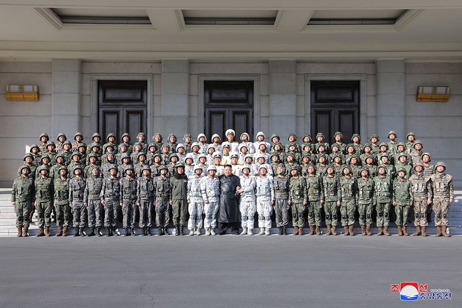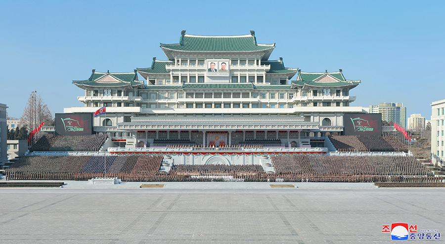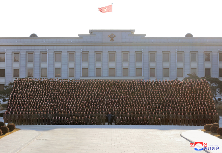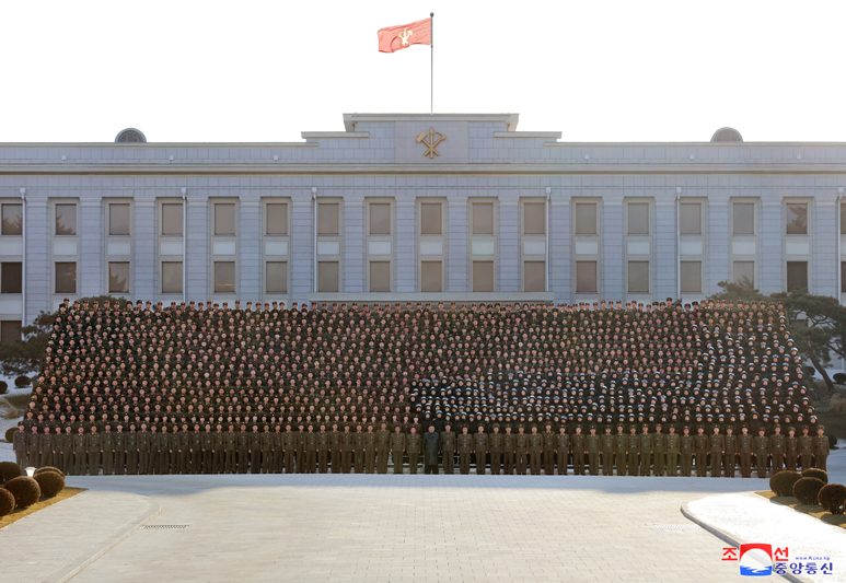 Vážený soudruh Kim Čong Un vyjádřil přesvědčení, že naše revoluční ozbrojené síly budou plnit své poslání a povinnost jako hybná síla obrany státu a spolehlivě bránit vlast a lid jako skutečná armádu lidu, a nechal se s účastníky vojenské přehlídky na památku vyfotografovat.