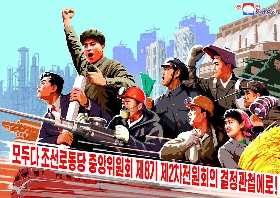 Plakát „Vše pro splnění závěrů 2. pléna 8. Ústředního výboru Korejské strany práce!“ vyzývá všechny členy strany a další pracující, aby jednotně povstali k novému revolučnímu pochodu s bezmeznou věrností velké věci strany.