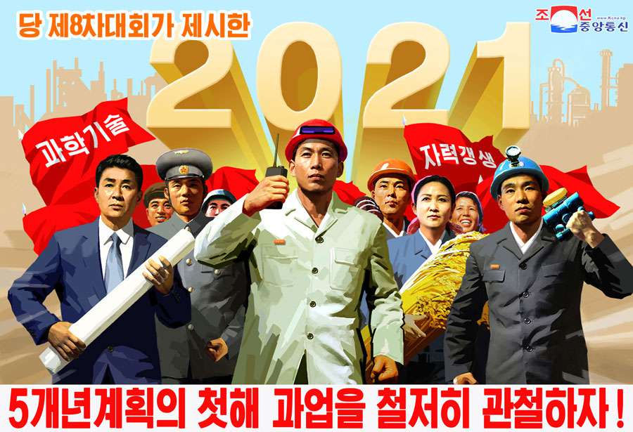Pchjongjang 14. února čučche 110 (2021) (KCNA) – Umělecké studio Mansude, Ústřední svaz výtvarných umění a Pchjongjangský institut výtvarných umění vytvořily a vydaly agitační plakáty, rázně povzbuzující ke splnění závěrů 2. pléna 8. Ústředního výboru Korejské strany práce.