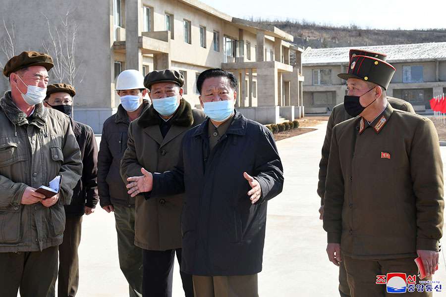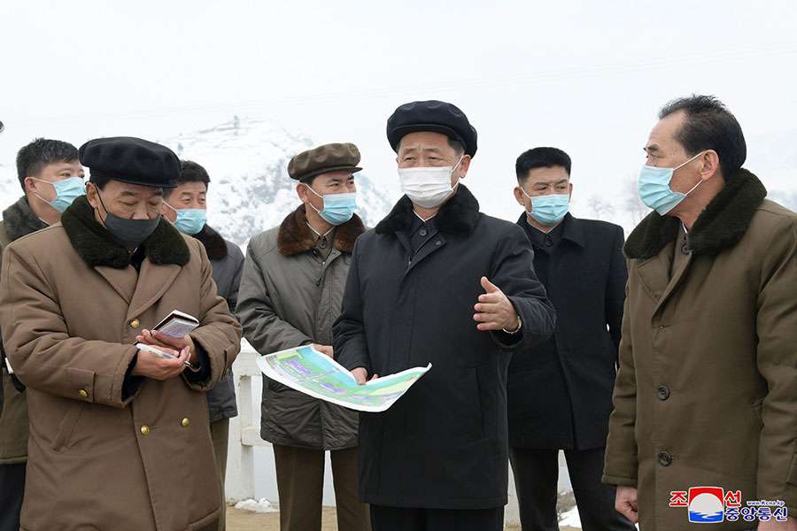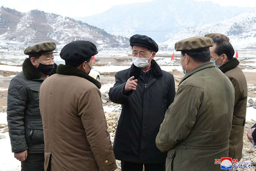 Člen prezídia politbyra Ústředního výboru Korejské strany práce, předseda vlády Korejské lidově demokratické republiky soudruh Kim Tok Hun se na místě seznámil se stavem přípravných prací na stavbu továren místního průmyslu v okrese Kimhwa.