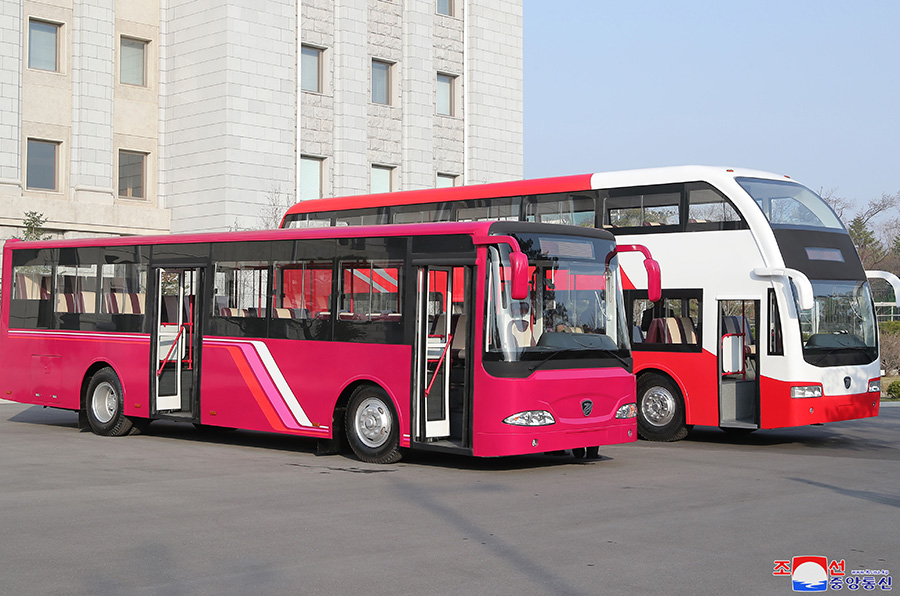 Pchjongjang 26. března čučche 110 (2021) (KCNA) – Generální tajemník Korejské strany práce a předseda pro státní záležitosti Korejské lidově demokratické republiky vážený soudruh Kim Čong Un se seznámil se zkušebními výrobky nových autobusů.