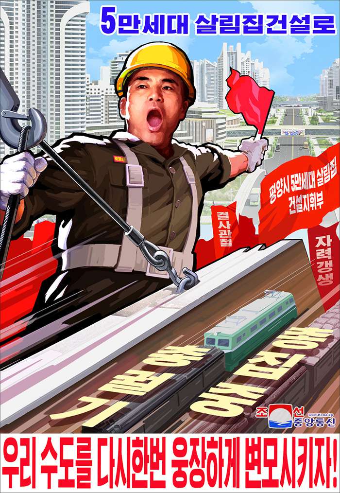 Plakát „Výstavbou budov s 50 tisíci byty znovu velkolepě změňme tvář našeho hlavního města!“ zdůrazňuje důležitost úžasné přeměny Pchjongjangu na majestátní a krásné město, které odráží myšlenku, ducha a živou dynamiku naší doby, stejně jako vysoký ideál a úroveň civilizace konkurenceschopné před celým světem.
