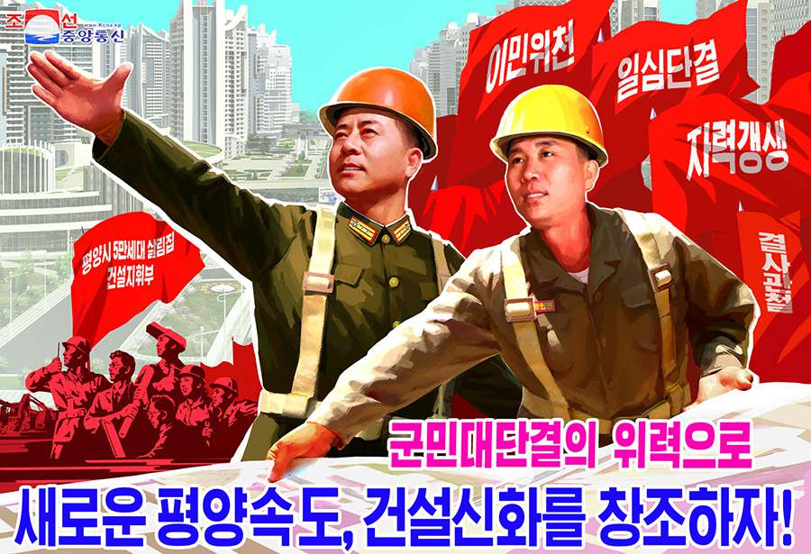 Plakát „Mocí velké jednoty armády a lidu vytvořme novou rychlost Pchjongjangu, legendu budování!“ odráží potřebu srdečně odpovědět na výzvu Ústředního výboru velké strany a prokázat sílu velké jednoty armády a lidu v boji za současnou velkolepou výstavbu ideální ulice lidu.