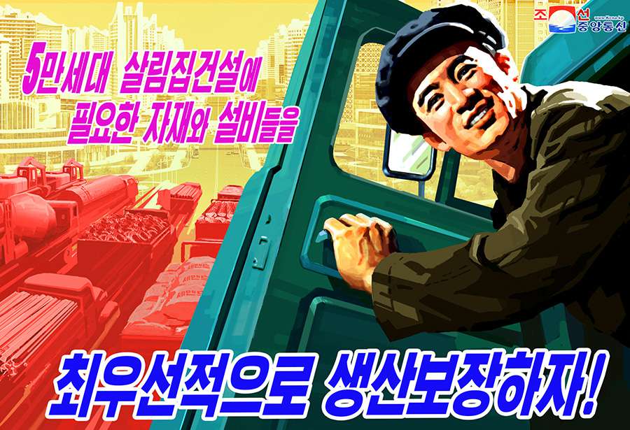 Plakát „Přednostně vyrobme a dodejme potřebné materiály a vybavení na stavbu budov s 50 tisíci byty!“ odráží hlubokou myšlenku, že by všichni měli jednotně povstat k výstavbě 50 tisíc bytů v Pchjongjangu, což je věcí ctěné touhy naší strany, jejímž cílem je poskytnout obyvatelům hlavního města lepší a kulturnější životní podmínky a v budování plně prokázat věrnost, vlastenectví a tvůrčí moudrost.