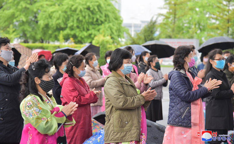Na nádvorí paláca sa masy poklonili pred portrétmi slnečne usmievavých veľkých vodcov. Funkcionári a pracujúci ľudia položili kvetinové koše, kytice a kvety a poklonili sa pred sochami veľkých vodcov na vrchu Mansu a vo všetkých ostatných častiach krajiny a mozaikami zobrazujúcimi veľkých vodcov.