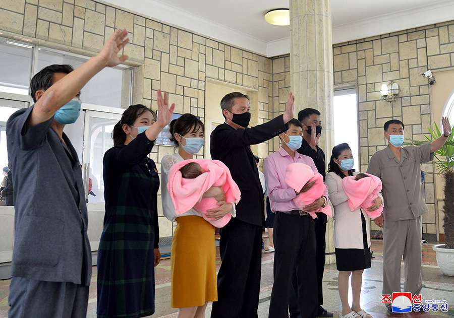 Pchjongjang 25. května čučche 110 (2021) (KCNA) – 513. trojčata (tři dcery), která se narodila v Pchjongjangské porodnici, byla 24. května propuštěna s blahopřáním mnoha lidí.