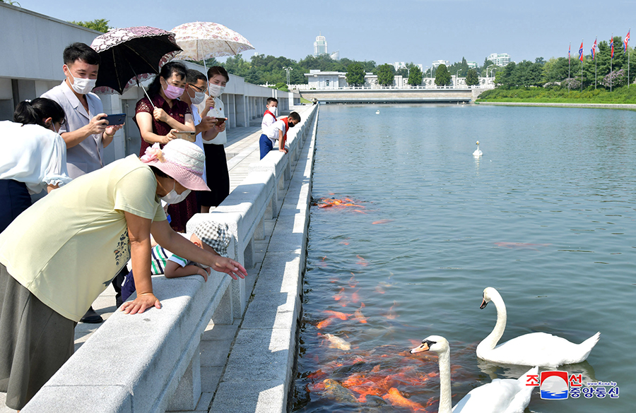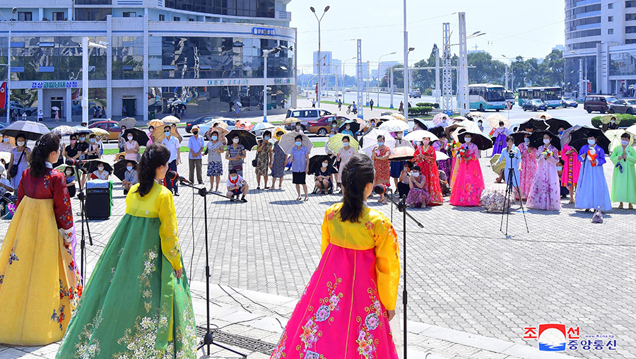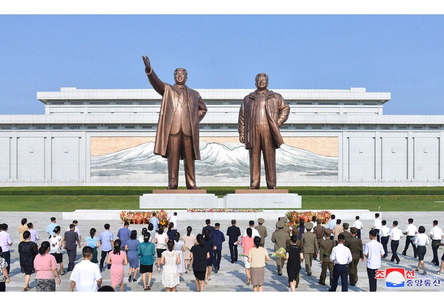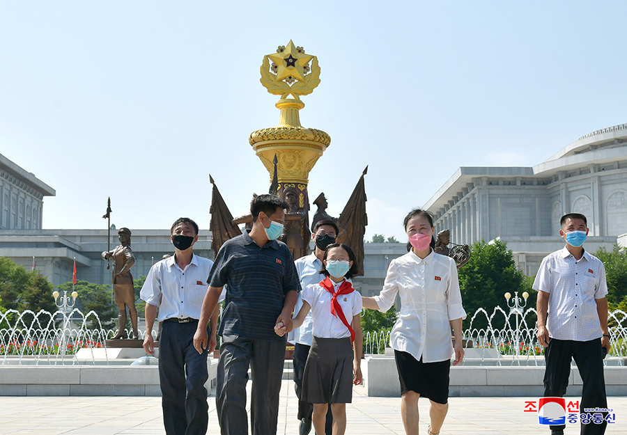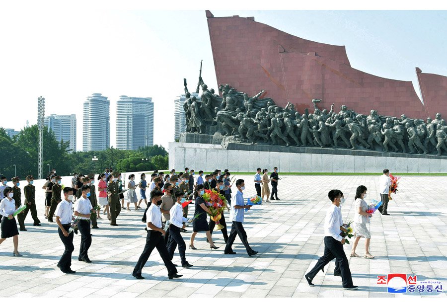 Pracující, sloužící mužstvo Korejské lidové armády a studenti  z různých míst navštívili bronzové sochy a portréty slunečně usměvavých velkých vůdců a vyjádřili jim oddanou úctu.