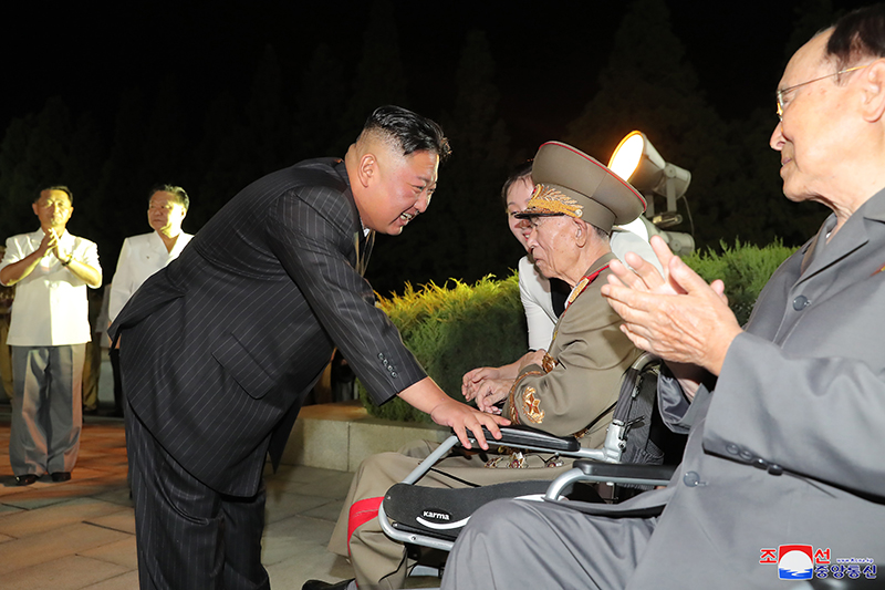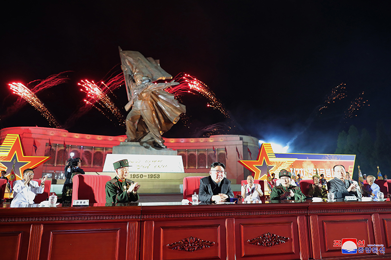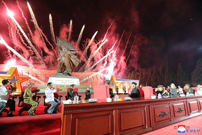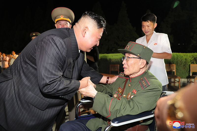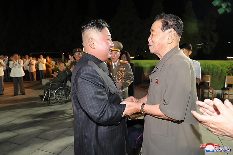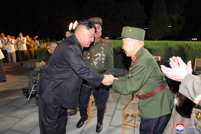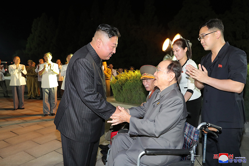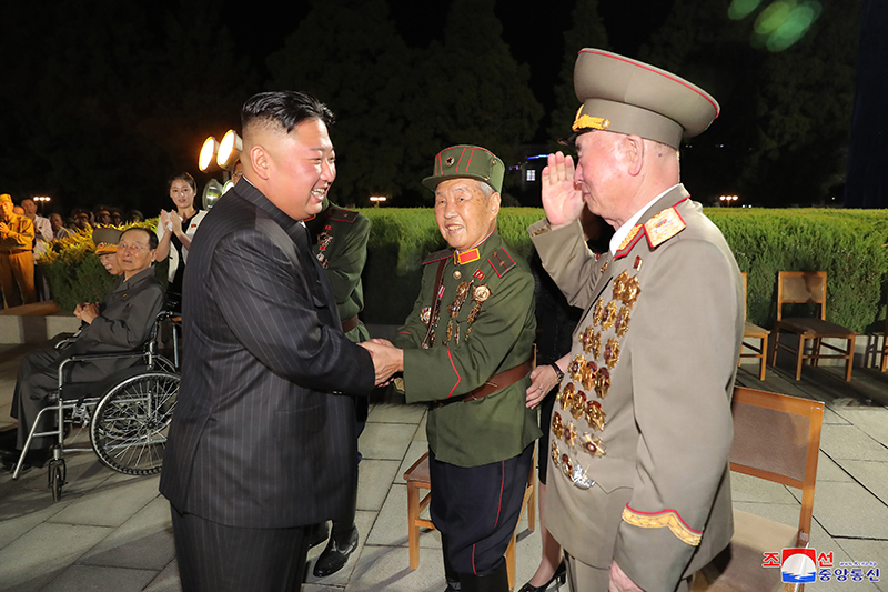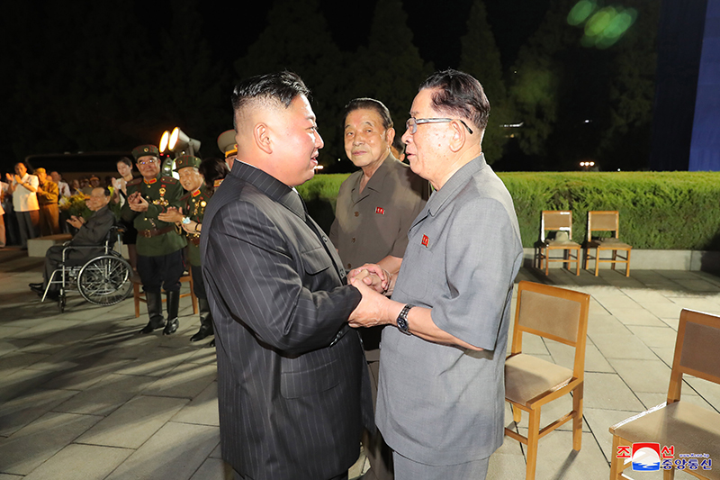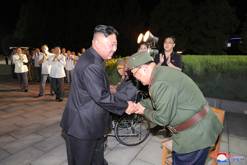 Soudruh Kim Čong Un vyjádřil potěšení, že se znovu setkává s válečnými veterány a slaví velký Den vítězství ve válce. Srdečně blahopřál účastníkům Vlastenecké osvobozenecké války a zasloužilým pracovníkům válečných let a všemu lidu celé země, který slaví 27. červenec.