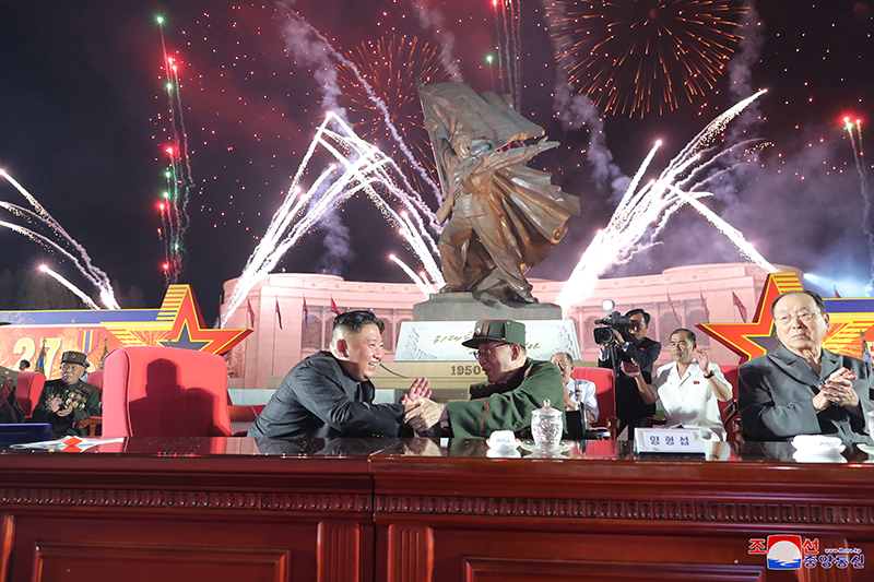 Vážený soudruh generální tajemník společně s válečnými veterány pohlédl na hlavní sochu „Vítězství“, jasně osvětlenou půvabnými ohňostroji, a vyjádřil přesvědčení, že velký duch a vůle 27. července se stane věčnou hybnou silou pokroku a rozvoje budování socialismu.