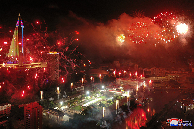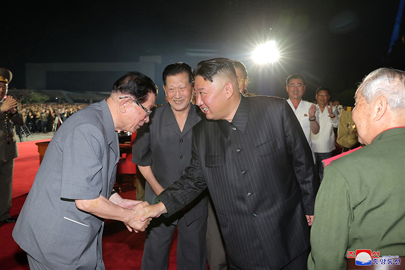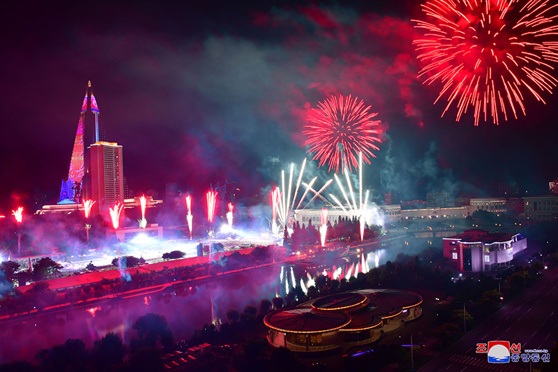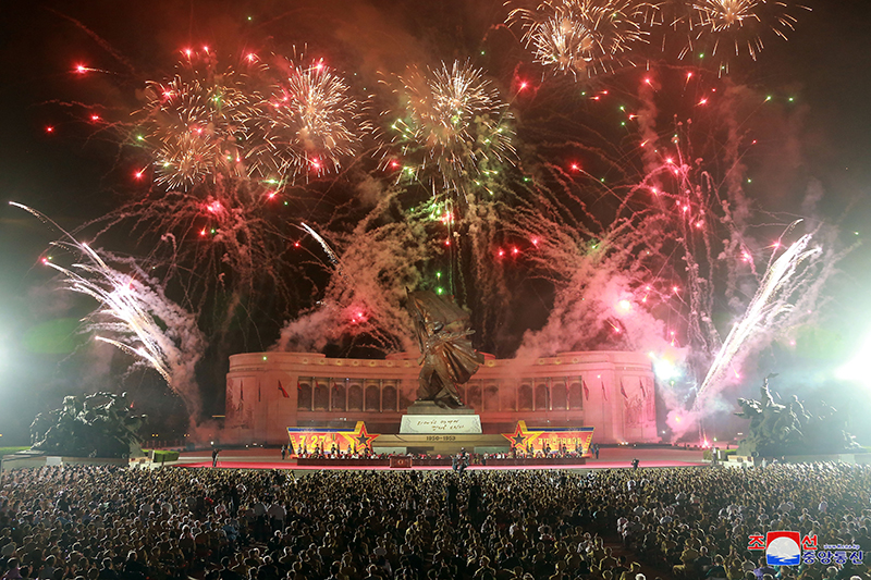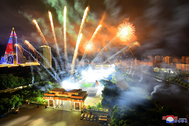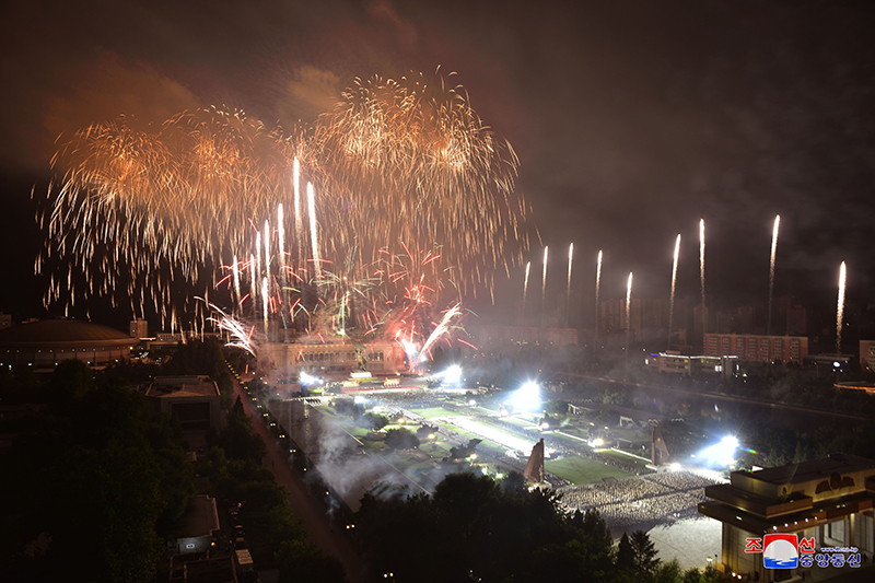 Za uvítacího pochodu přišel vešel vážený soudruh generální tajemník společně s válečnými veterány na tribunu. V tu chvíli byl odpálen slavnostní ohňostroj a místo setkání hřmělo bouřlivým jásotem „Hurá!“ na znamení úcty k váženému soudruhu Kim Čong Unovi, symbolu síly naší neporazitelné strany a našeho důstojného státu, praporu všech vítězství a slávy.
