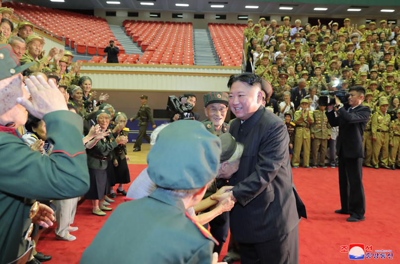 Pchjongjang 30. července čučche 110 (2021) (KCNA) – Generální tajemník Korejské strany práce a předseda pro státní záležitosti Korejské lidově demokratické republiky vážený soudruh Kim Čong Un se 29. července setkal s účastníky 7. celostátního shromáždění válečných veteránů a nechal se s nimi na paměť vyfotografovat.