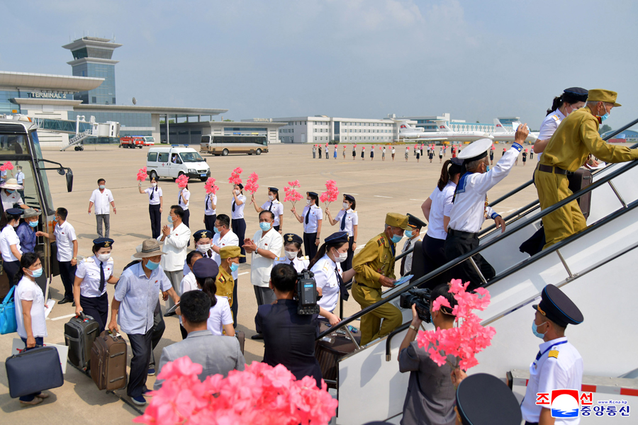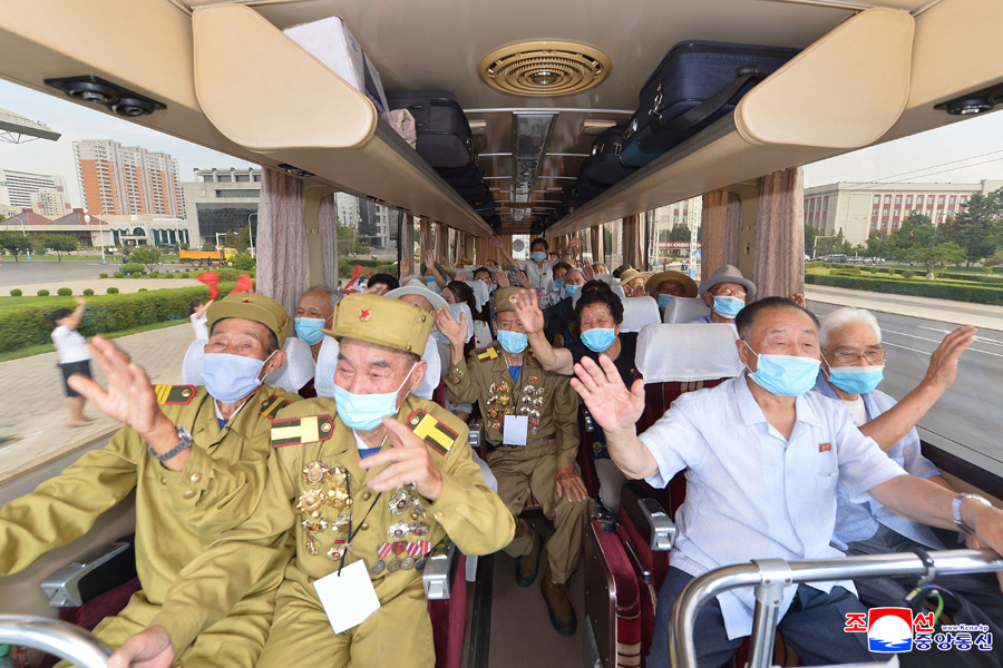 Účastníci 7. celostátního shromáždění válečných veteránů opouštějí Pchjongjang
