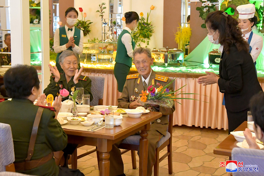 Všichni veteráni celou duší pociťovali, jak s jejich přibývajícími dny vzrůstá péče strany, a stěží potlačovali své dojetí, díky kterému se cítili znovu mladí. Uvedli, že soudruh Kim Čong Un projevil velkou důvěru a lásku, když spolu s válečnými veterány oslavil Den vítězství a pronesl zanícený blahopřejný projev, v němž popřál pevné zdraví soudruhům válečným veteránům, kteří dodávají obrovskou sílu naší straně a lidu a jsou velkým povzbuzením pro naši revoluci. Navíc se s nimi nechal na paměť vyfotografovat a zajistil jim příjemný odpočinek. Dojatě říkali, že nikde na světě není takový velikán jako náš maršál.