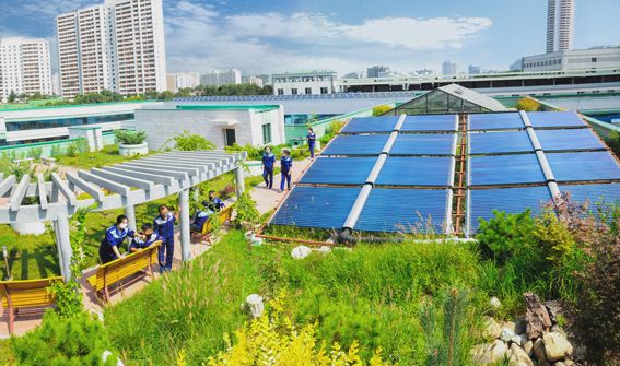V Pchjongjangu, hlavnom meste Kórejskej ľudovodemokratickej republiky, svižne prebieha ekologizácia striech budov, aby sa budovy a príroda spojili do jedného a občanom poskytli vynikajúce životné prostredie.