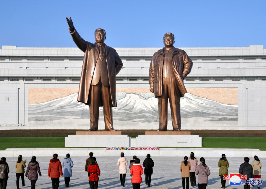 Mnoho lidí navštívilo bronzové sochy velkého vůdce a velkého generála a mozaiky slunečně usměvavých velikánů na různých místech země včetně vrchu Mansude, položili k nim květiny a poklonili se jim.