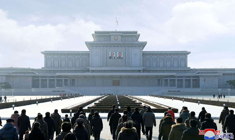 Vážený soudruh generální tajemník vstoupil do sálů nesmrtelnosti, kde leží velký vůdce soudruh Kim Ir Sen a velký vůdce soudruh Kim Čong Il ve své životní podobě, a poklonil se jim v nejhlubší úctě na počest Nového roku.
