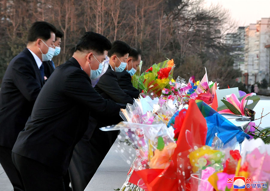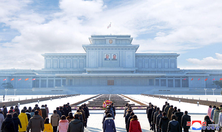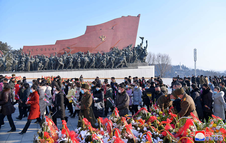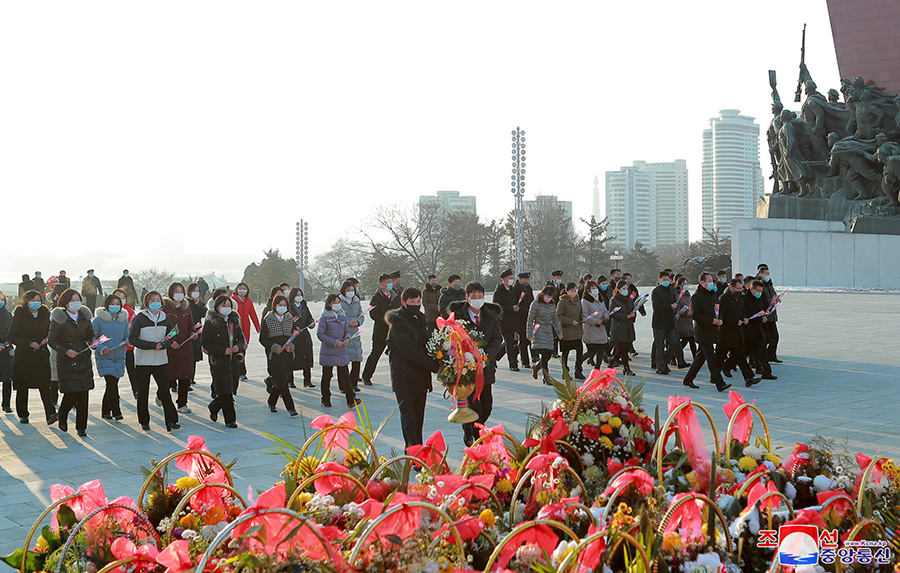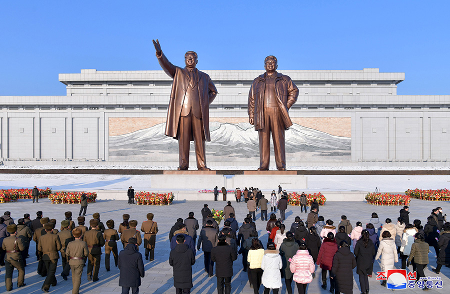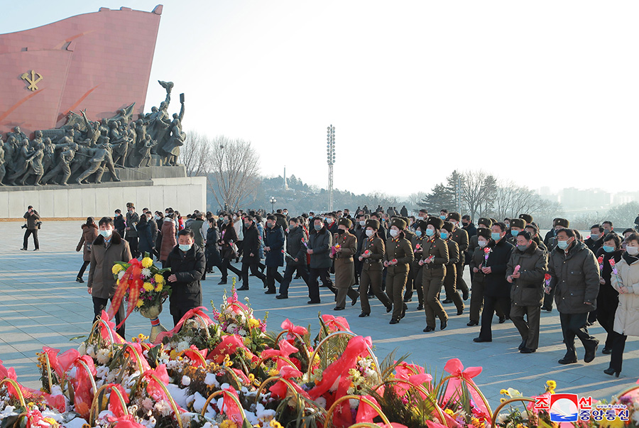 Pracující lid a sloužící mužstvo lidové armády položili koše a kytice květin k bronzovým sochám a mozaikám s portréty velkého vůdce a velkého generála se slunečným úsměvem na všech místech země, včetně vrchu Mansude a města Samdžijon, a poklonili se jim.
