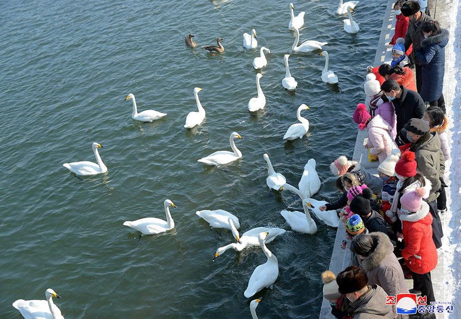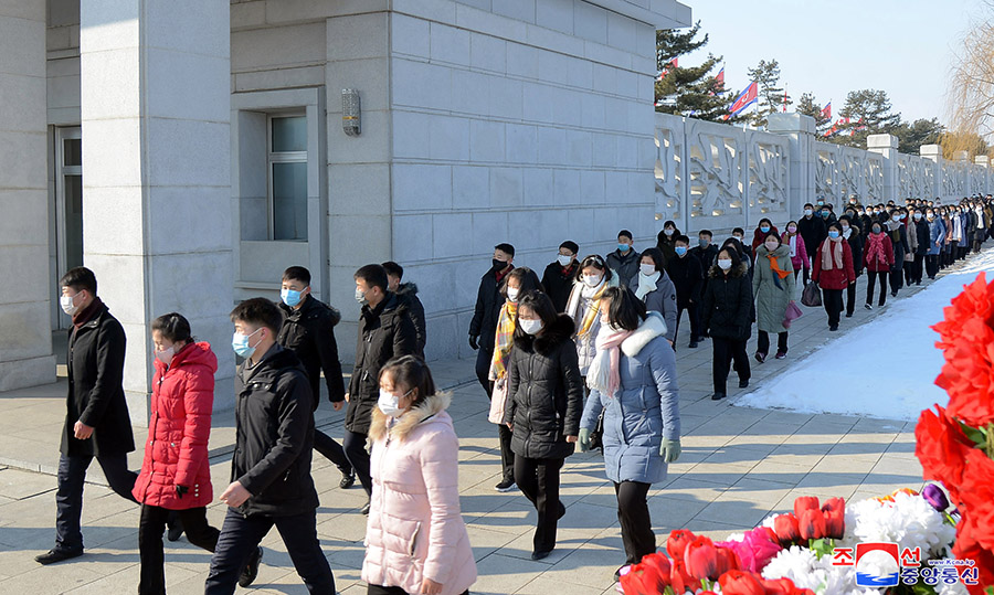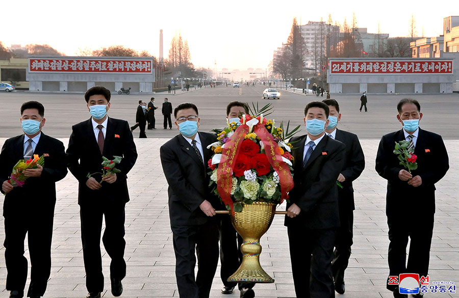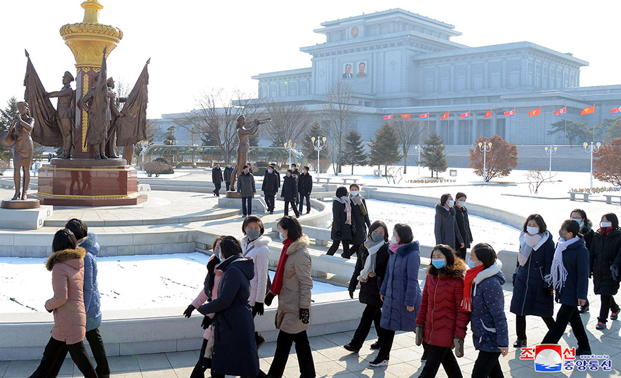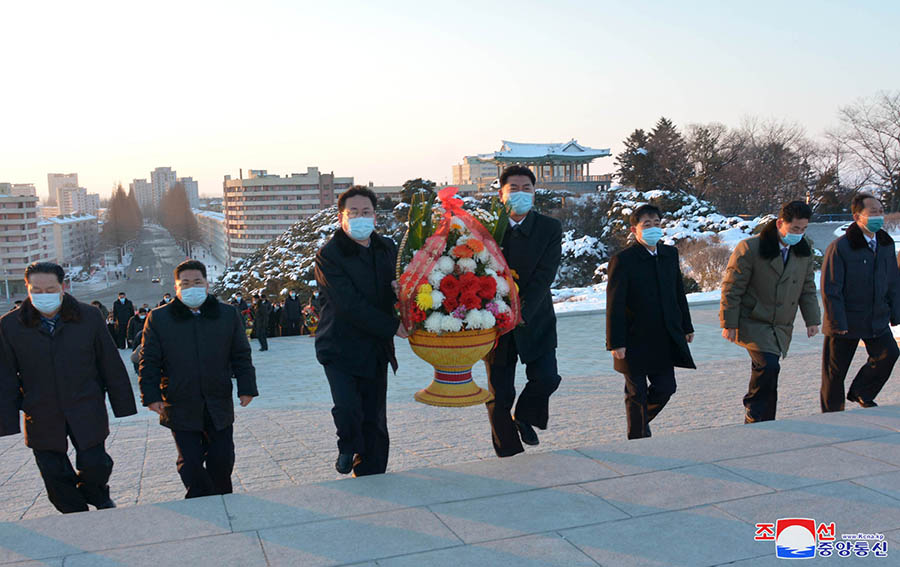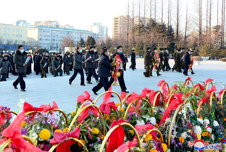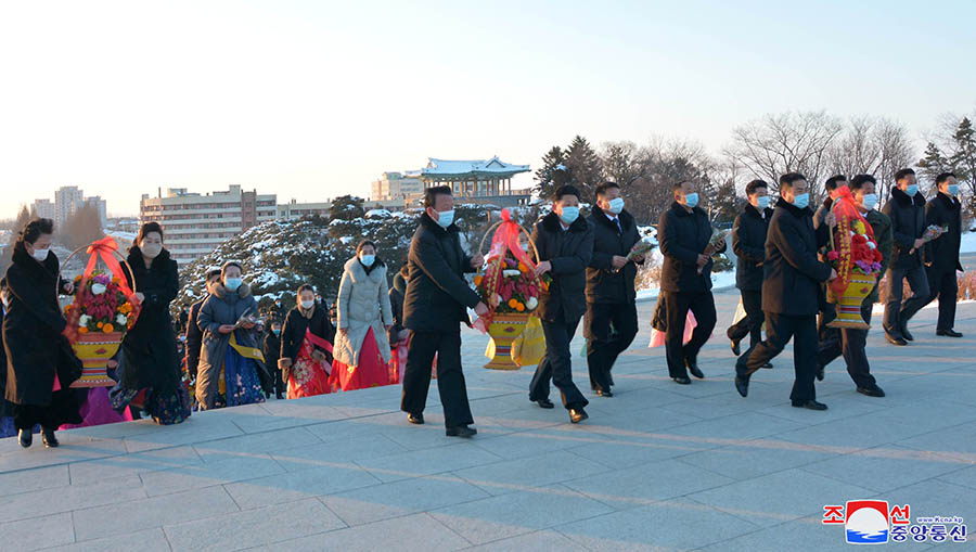 Pracující lid a sloužící mužstvo lidové armády položili koše a kytice květin k bronzovým sochám a mozaikám s portréty velkého vůdce a velkého generála se slunečným úsměvem na všech místech země, včetně vrchu Mansude a města Samdžijon, a poklonili se jim.