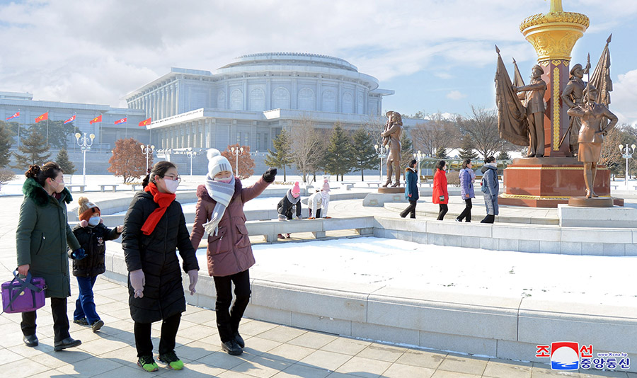 V parku Paláce slunce Kumsusan, nejvyšší svatyně čučche, kde leží ve své životní podobě velký vůdce soudruh Kim Ir Sen a velký vůdce soudruh Kim Čong Il, se lid poklonil portrétům velkého vůdce a velkého generála se slunečným úsměvem.