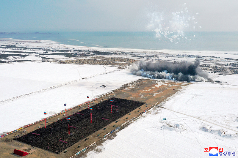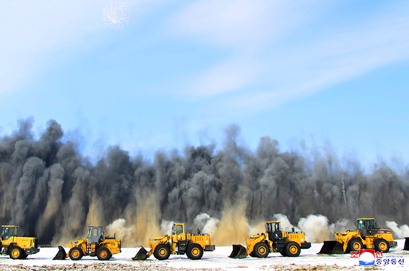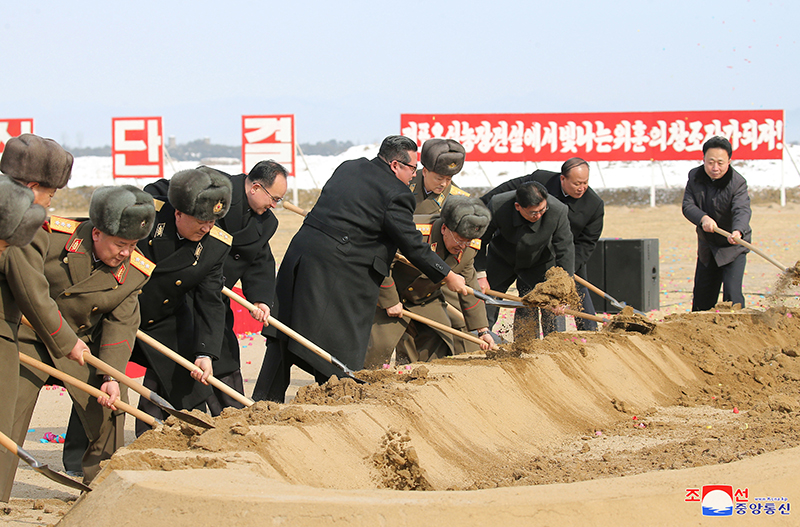 Na památku zahájení výstavby skleníkového zemědělského družstva odhodil vážený soudruh Kim Čong Un osobně první rýč zeminy a následně stiskl tlačítko elektrického odstřelu.