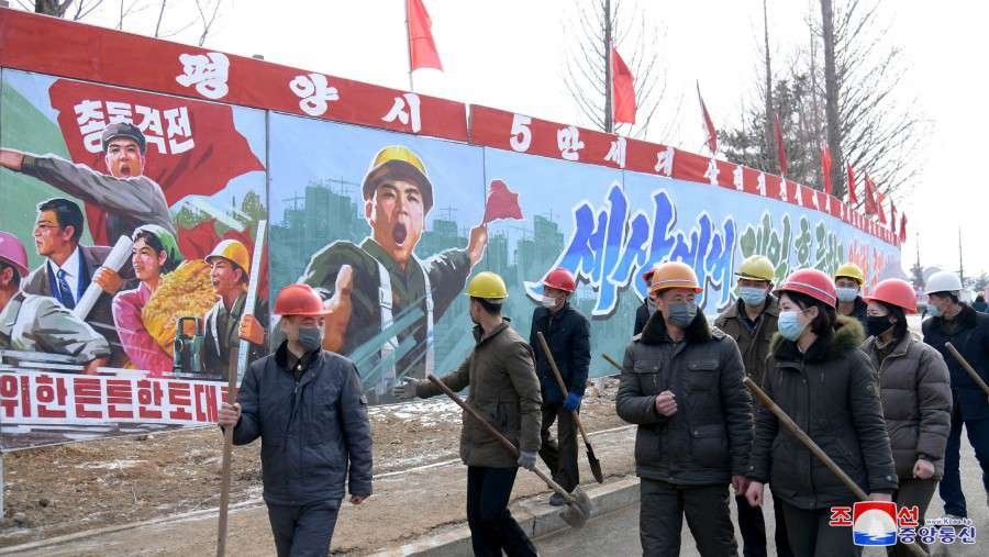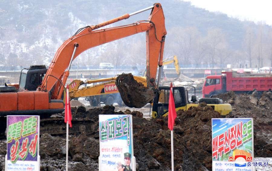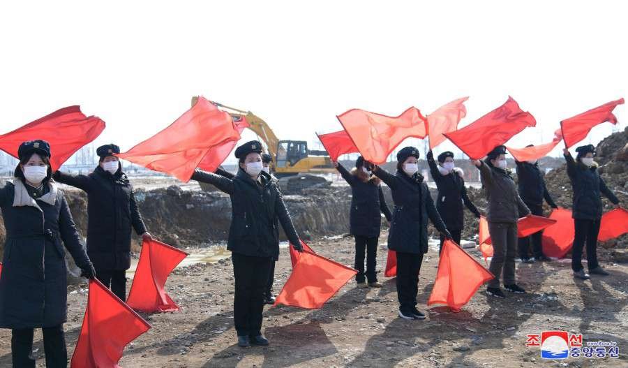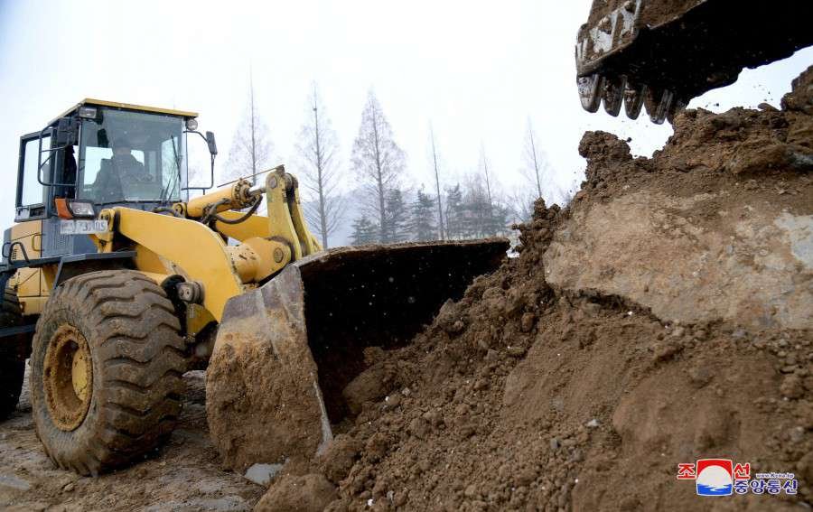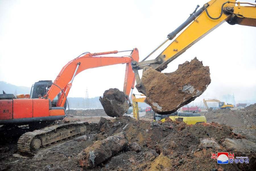 Pchjongjang 24. února čučche 111 (2022) (KCNA) – Na staveništi obytných budov s 10 000 bytovými jednotkami v oblasti Hwasong vojenští a civilní stavební dělníci energicky urychlují kopání základových jam.