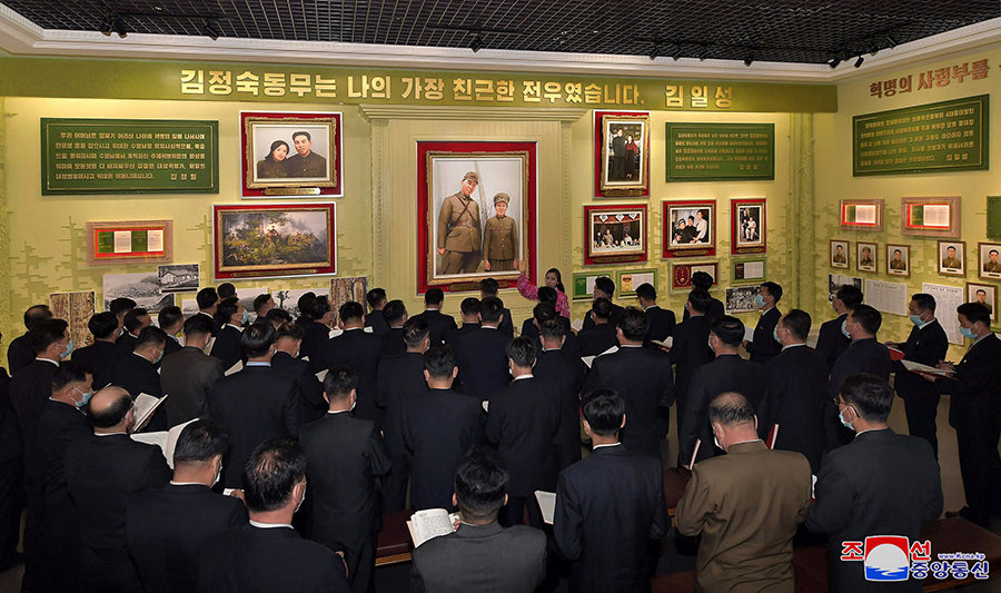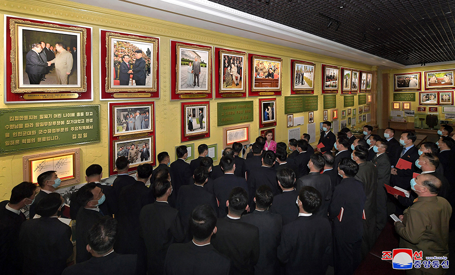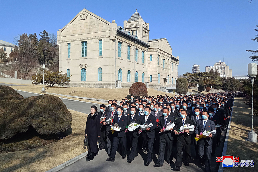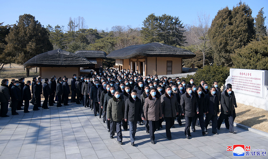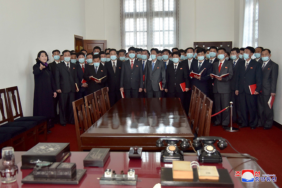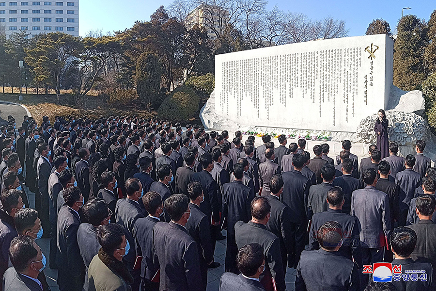 Pchjongjang 3. března čučche 111 (2022) (KCNA) – Generální tajemník Korejské strany práce a předseda pro státní záležitosti Korejské lidově demokratické republiky vážený soudruh Kim Čong Un byl 2. března vyfotografován s účastníky 2. konference tajemníků základních organizací Korejské strany práce.