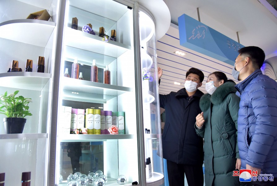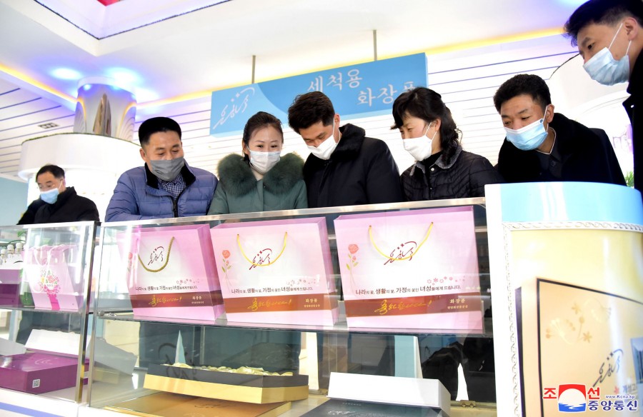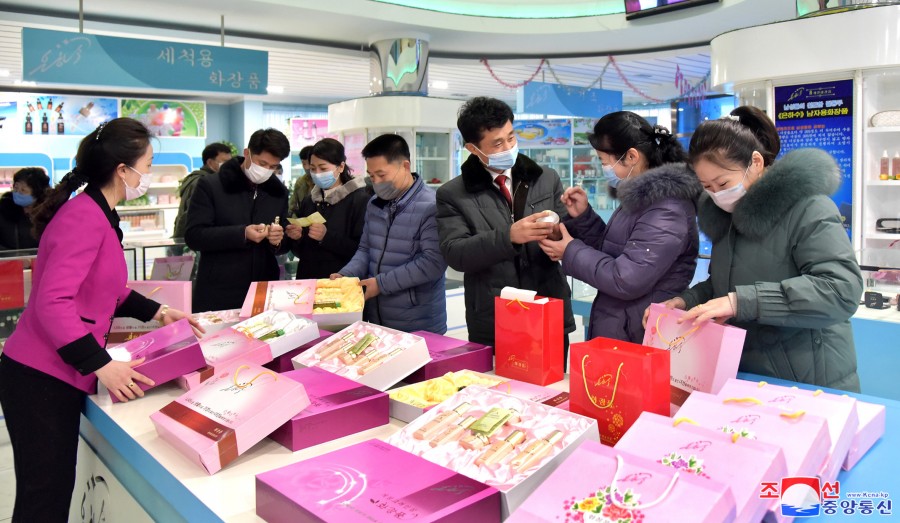 Pchjongjang 7. března čučche 111 (2022) (KCNA) – V předvečer Mezinárodního dne žen, 8. března, mnoho lidí navštěvuje výstavní síň kosmetiky Pchjongjangské kosmetické továrny.