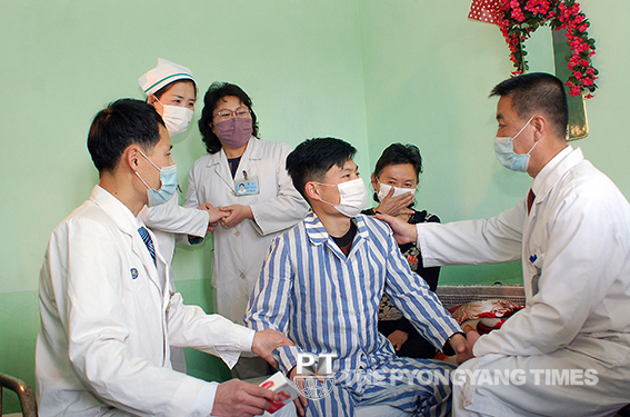 Keď sa vrátil domov a musel ležať, zdravotnícki pracovníci okresnej ľudovej nemocnice Sunan v Pchjongjangu sa dobrovoľne ujali starostlivosti o postihnutého vojaka.