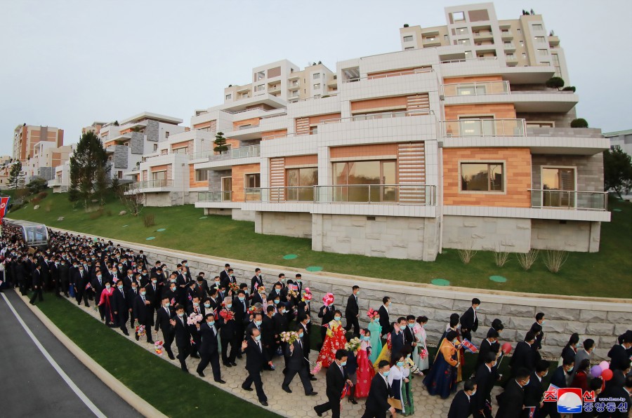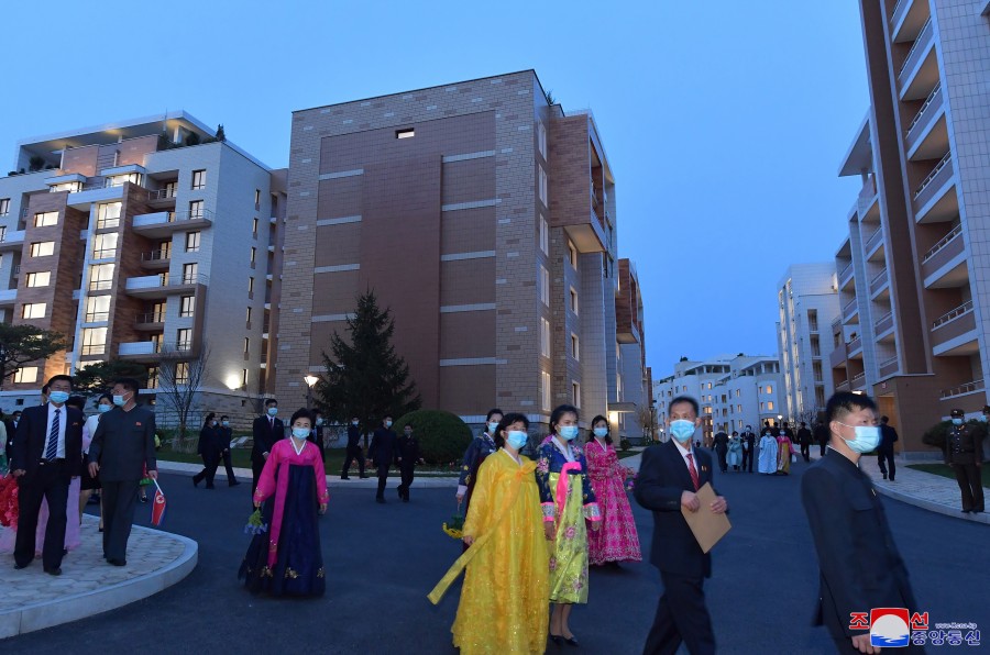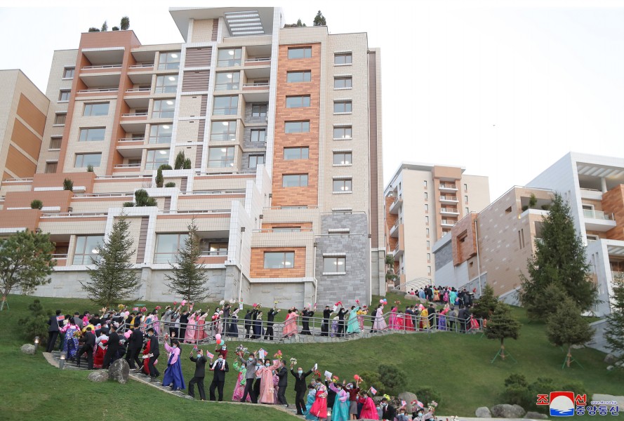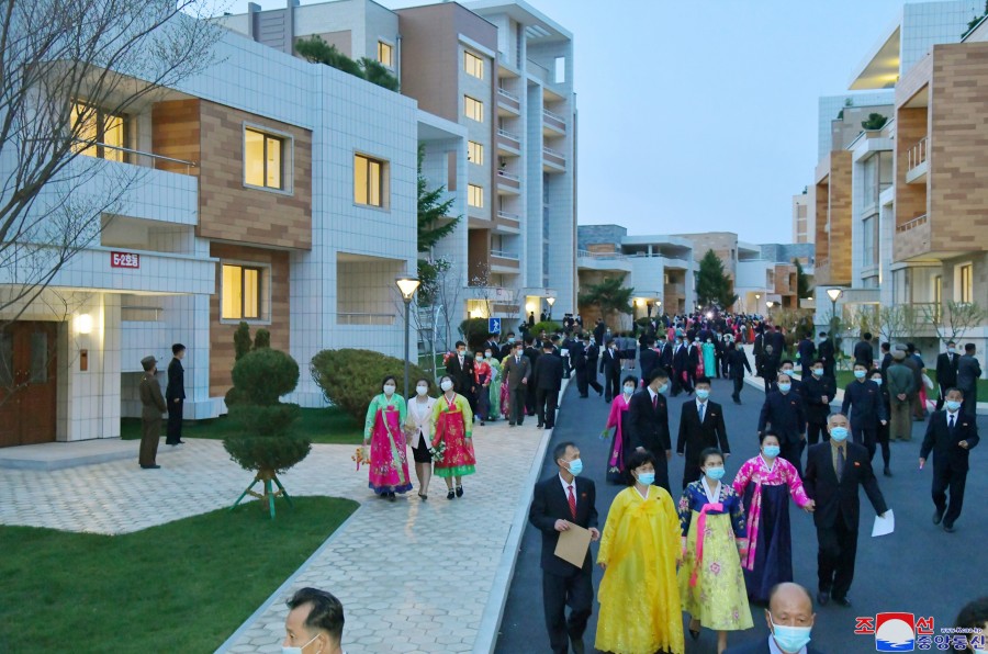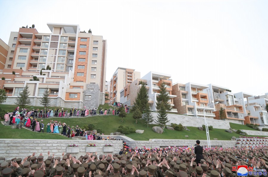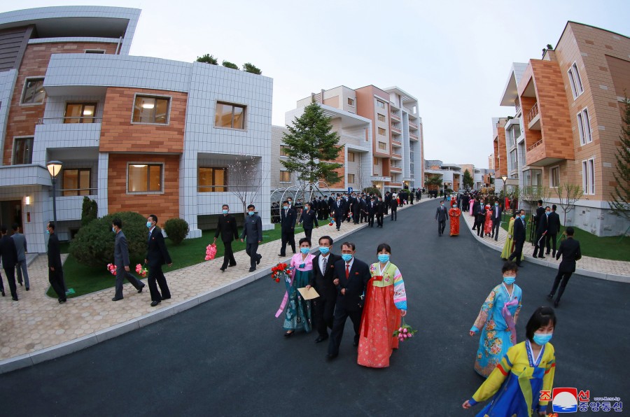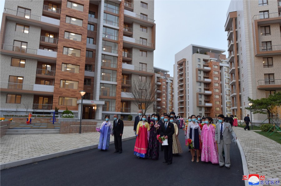 Po obřadu si zasloužilí lidé a jejich rodiny, kteří budou bydlet ve čtvrti Kjongru-dong, prohlédli společně s obyvateli města obytné budovy.