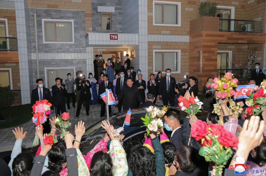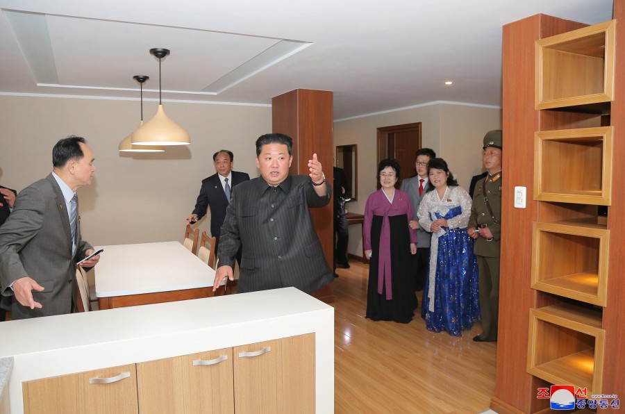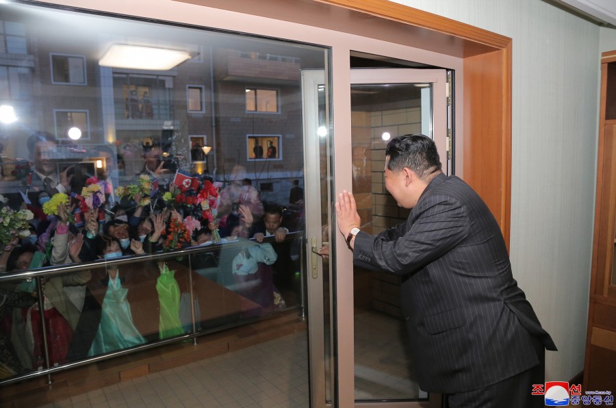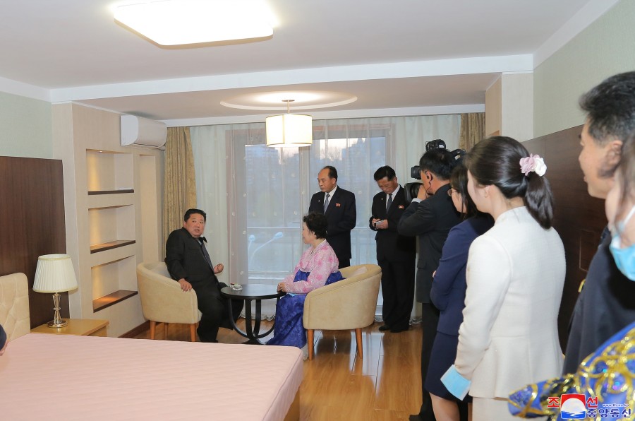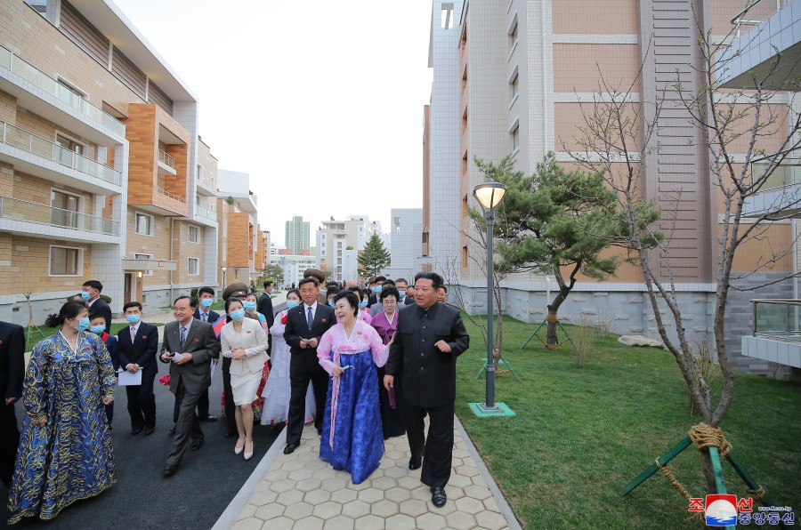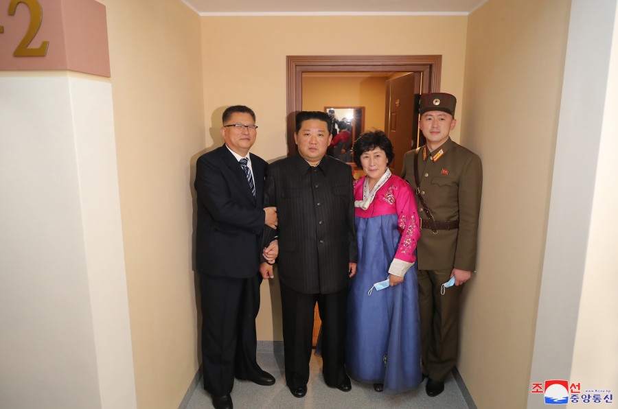 Po obřadu si zasloužilí lidé a jejich rodiny, kteří budou bydlet ve čtvrti Kjongru-dong, prohlédli společně s obyvateli města obytné budovy.