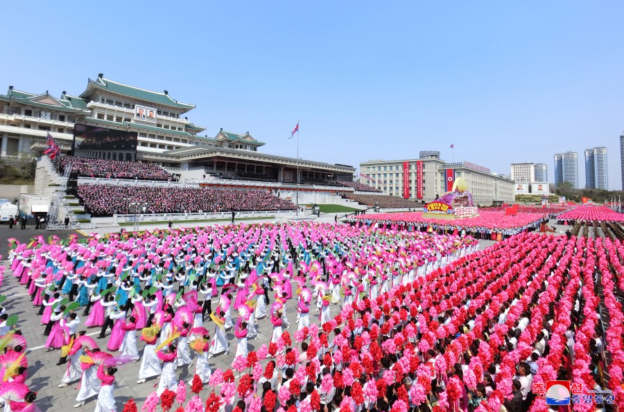 Tančící oddíly dělníků a rolníků a další vesele pochodovaly se vztyčenými hesly „Naše socialistická země založená vůdcem!“, „Legendární kůň Čchollima přivolaný vůdcem!“ a „Nekonečná cesta pro lid!“