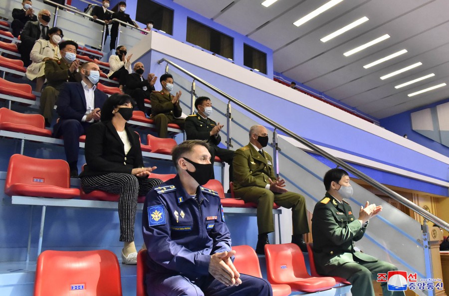 Doprovázely ho kádry strany a vlády, mezi nimi člen prezídia politbyra Ústředního výboru Korejské strany práce, 1. místopředseda Komise pro státní záležitosti KLDR a předseda prezídia Nejvyššího lidového shromáždění soudruh Čche Rjong He, člen prezídia politbyra ÚV KSP a tajemník pro organizační záležitosti ÚV strany soudruh Čo Jong Won a člen prezídia politbyra ÚV KSP, místopředseda Komise pro státní záležitosti KLDR a předseda vlády soudruh Kim Tok Hun, pracovníci Ústředního výboru strany, členové vlády a vedoucí funkcionáři organizací pracujícího lidu, jakož i vedoucí funkcionáři ozbrojených sil.