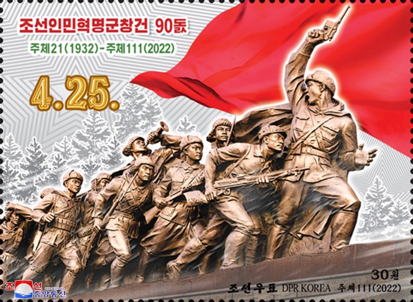 Pchjongjang 25. dubna čučche 111 (2022) (KCNA) – U příležitosti 90. výročí založení Korejské lidové revoluční armády vydala Státní správa poštovních známek nové známky (1 aršík, 1 jednotlivou známku).