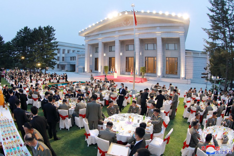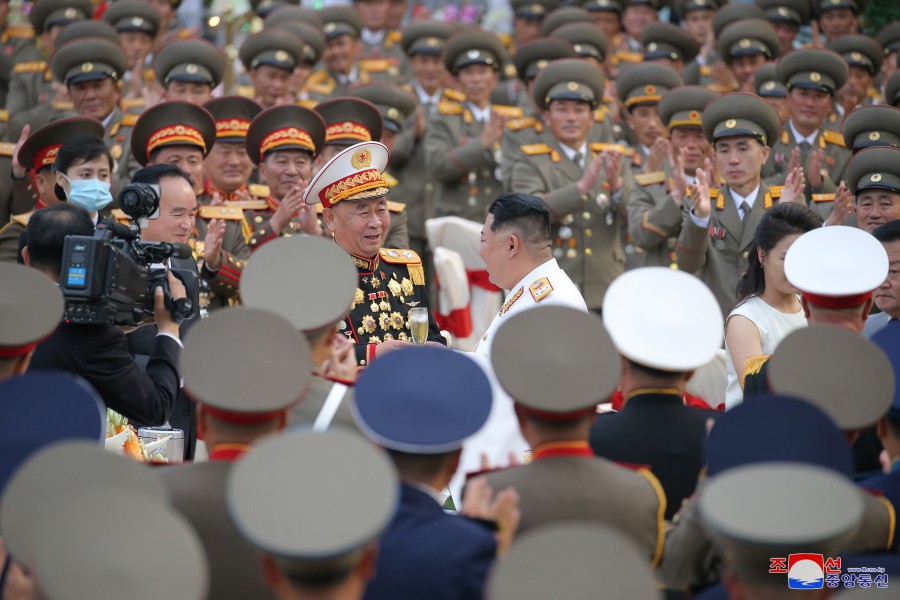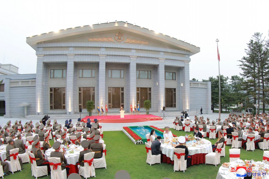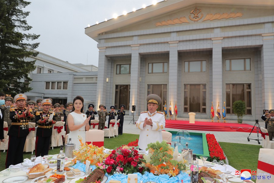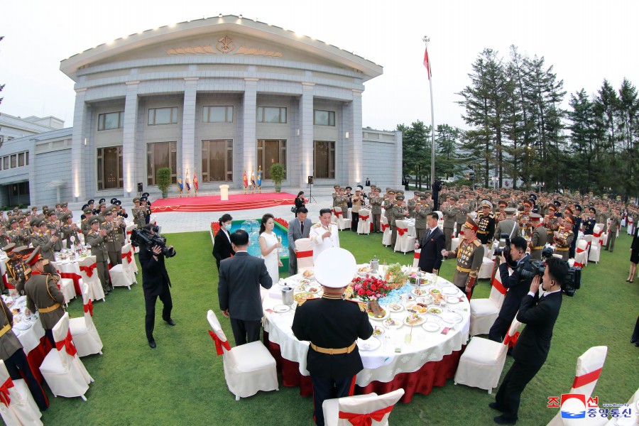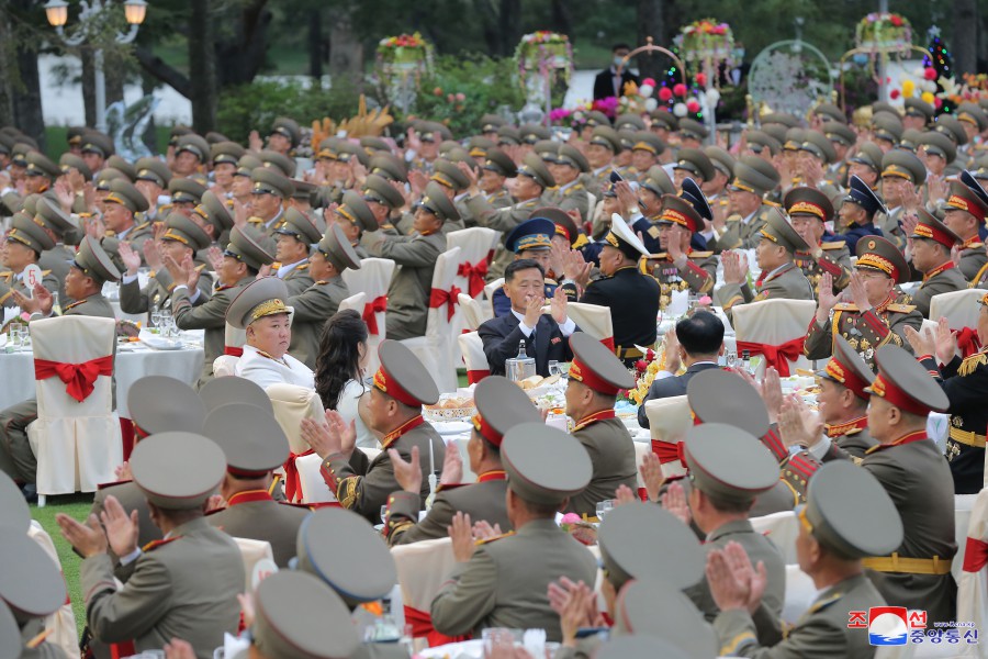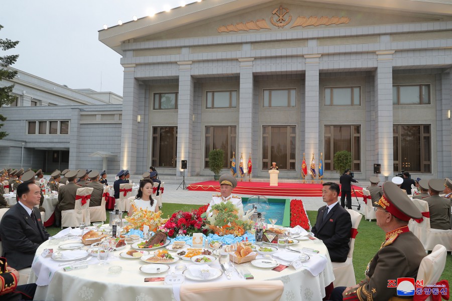 V atmosféře manifestace horoucích citů pokrevní spřízněnosti mezi vůdcem a vojáky v boji za uskutečnění velké věci budování vzkvétajícího státu a posilování ozbrojených sil se za účasti váženého soudruha Kim Čong Una a jeho manželky Ri Sol Džu na zahradě sekretariátu konala slavnostní recepce.