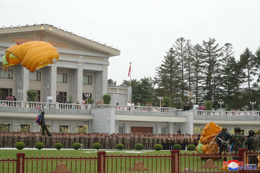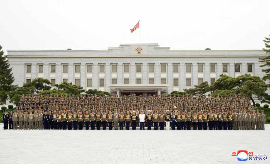 Soudruh Kim Čong Un řekl, že naše revoluční ozbrojené síly by se měly stát rudou zbraní a cenným rudým mečem strany, bránícím rudý prapor, rudé ideje a rudý řád, a nechal se na paměť vyfotografovat se svými milovanými vojáky, kteří hrají hlavní roli v boji za neustálé posilování a rozvoj lidové armády.