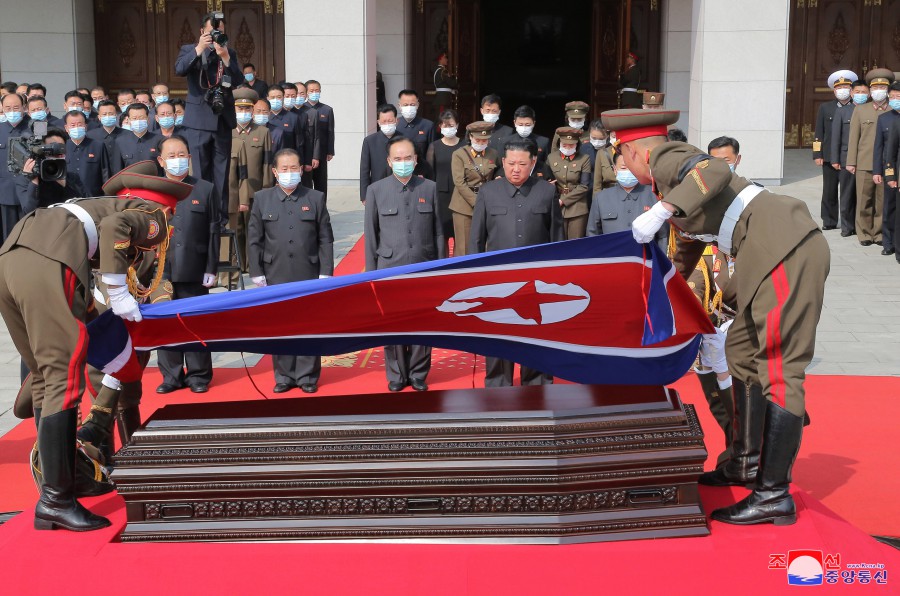 Čestná stráž na znamení úcty všech vojáků Korejské lidové armády slavnostně přikryla rakev posvátným praporem slávy, státní vlajkou KLDR.