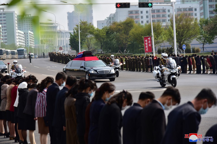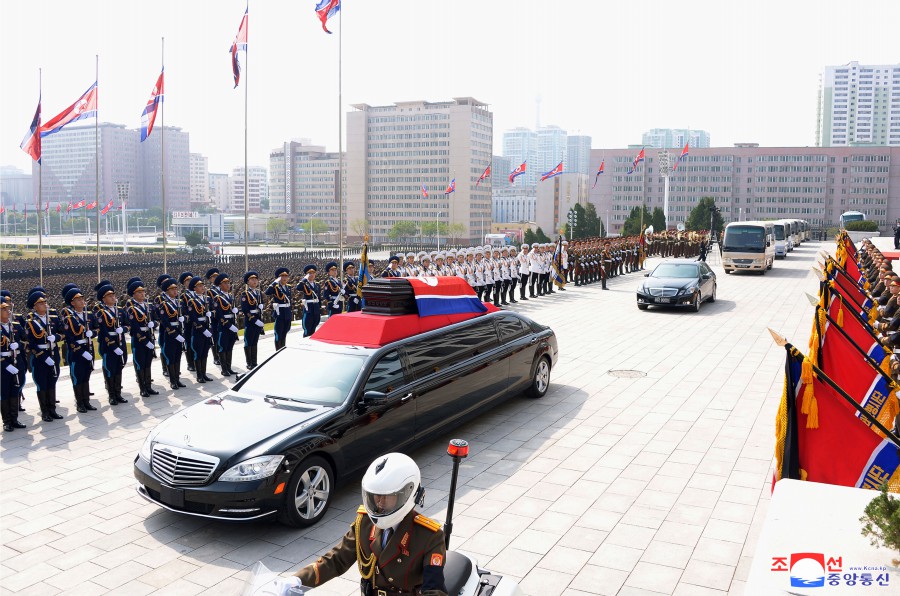 Automobil s rakví zesnulého projel před kolonou s vojenskými prapory Korejské lidové armády a čestnou stráží salutující zesnulému soudruhu Hjon Čchol He a za doprovodu motocyklů vyjel na ulici.