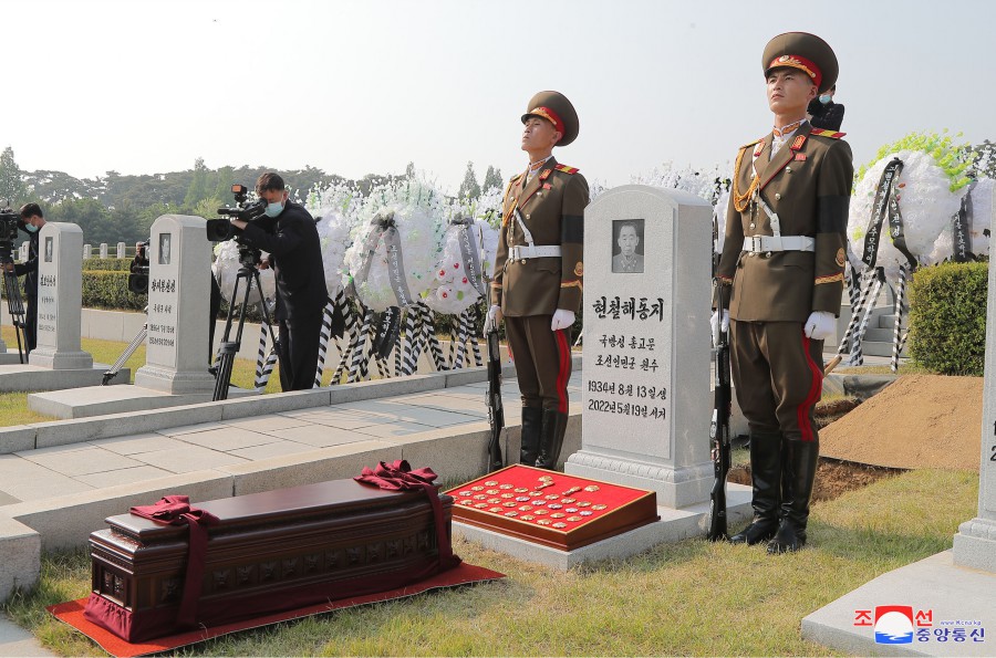 Pchjongjang 23. května čučche 111 (2022) (KCNA) – 22. května dopoledne se v „Domě kultury 25. dubna“ uskutečnil obřad vynesení rakve zesnulého hlavního poradce Ministerstva obrany Korejské lidově demokratické republiky, maršála Korejské lidové armády soudruha Hjon Čchol He.