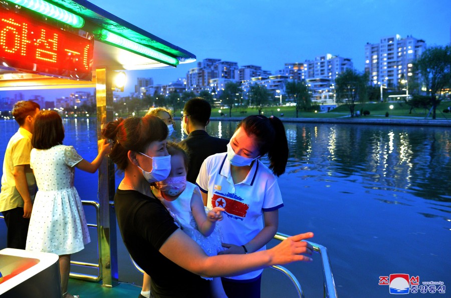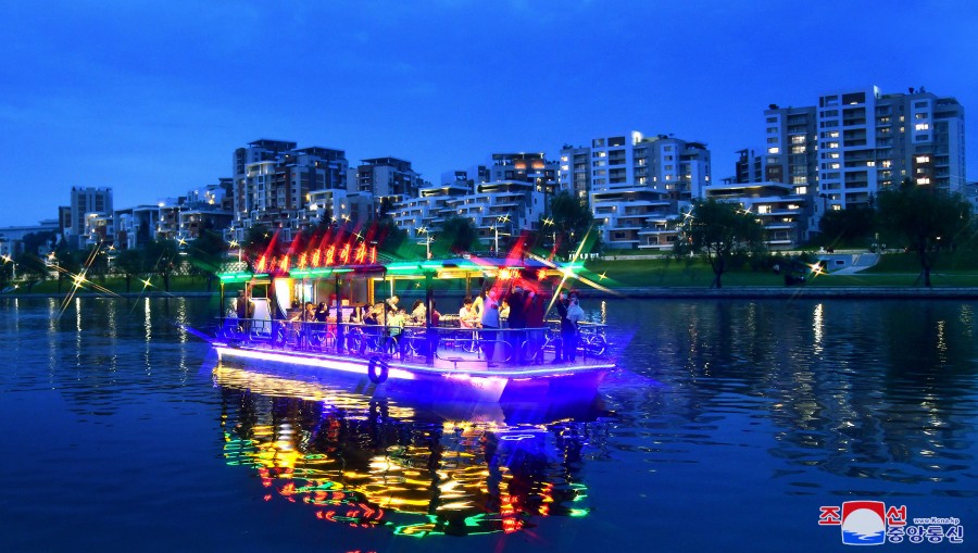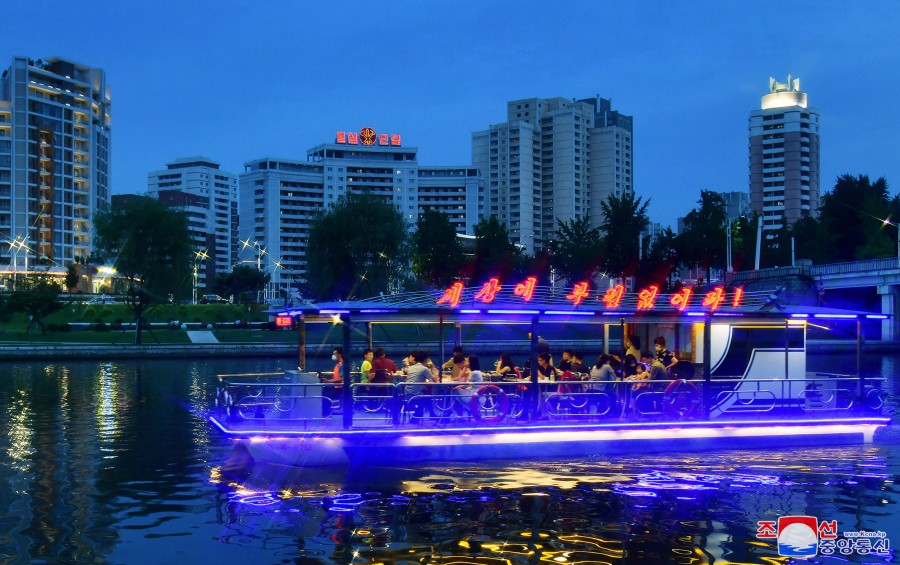 Pchjongjang 21. července čučche 111 (2022) (KCNA) – Nová vyhlídková loď postavená lidovým výborem obvodu Potchonggang jezdí mezi ostrovem Mo a ostrovem Kumran a přináší krásné výhledy na břehy řeky Potchong, zkrášlené společně s výstavbou nové obytné čtvrti Kjongru-dong.