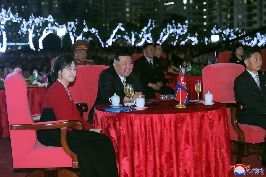 Za uvítacího pochodu vešli na místo oslav vážený soudruh Kim Čong Un a jeho manželka Ri Sol Džu.