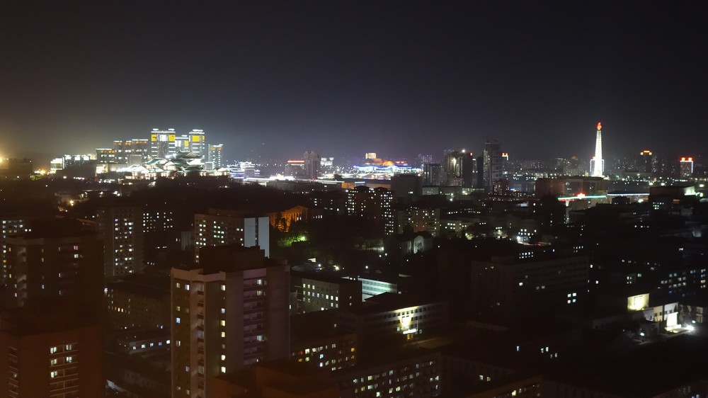 Pohled z hotelového pokoje na večerní centrum Pchjongjangu