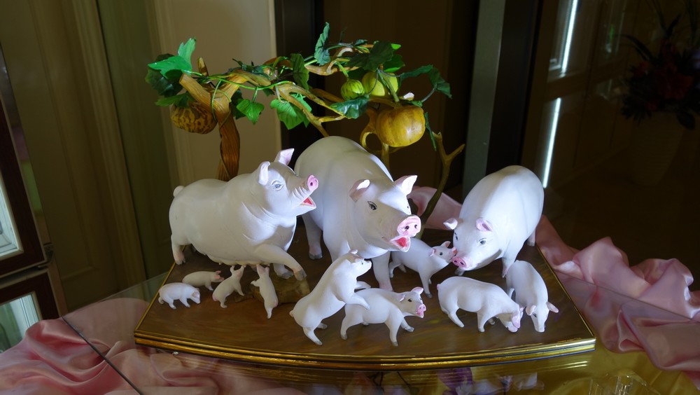 Výzdoba jídelny hotelu Korjo – sousoší veselých prasátek