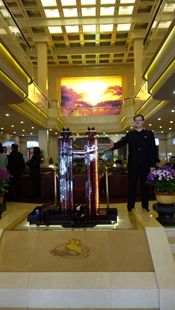 V Korjo hotelu jsem byl ubytován při všech třech svých pobytech. Lze předpokládat, že hotel je povětšinu času poloprázdný nebo zcela prázdný (nemluvě o období od pandemie, kdy jsou hranice KLDR uzavřeny), protože je obrovský, tvořený dvěma budovami se 43 patry a spojovacím mostem v horní části, což je symbolika dvou polovin rozdělené Koreje a podané ruky mezi nimi. Na vrcholech obou budov se nacházejí otočné restaurace, v provozu je však jen jedna z nich, druhá je prázdná.