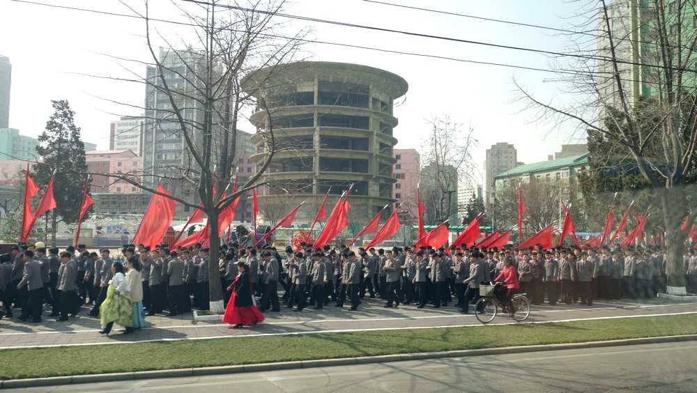 U výstupu z výtahů v horní části foyer byl umístěn plastový telefon s kulatým číselníkem jistě z doby inaugurace hotelu. Vyfotil jsem si jej a jakýsi zaměstnanec na mě začal zpovzdálí korejsky halekat. I když jsem se mu snažil anglicky věc vysvětlit, halekal korejsky pořád dál, až jsem raději snímek smazal. (Ale zdálky ten telefon na jiné fotce stejně mám.) Pěkný telefon z roku 1985 není možné fotografovat, aby to nebudilo ve světě pohoršení, ale spoustu mnohem smutnějších jevů lze pozorovat i fotit normálně a nikdo se jimi nezabývá. Například hned vedle hotelu se nachází (nebo v době našich návštěv nacházelo) dost velké opuštěné staveniště, opuštěné zjevně již dost dlouho, s trčícími zrezavělými dráty z betonu a omšelými betonovými základy částečně zaplavenými vodou. Staveniště nebylo plně oploceno a volně přes něj přecházeli chodci. Kdekdo ze zahraničních turistů na to koukal z oken a fotografoval to odtamtud. Tato smutná vizitka je dalším z důkazů, že KLDR není před světem Potěmkinovou vesnicí a snad ani nechce být, a pokud snad přece jen chce, nejde jí to.