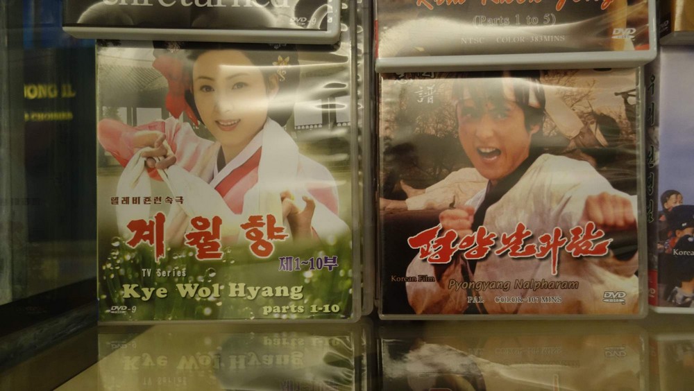 DVD se seriálem Kje Wol Hjang (vlevo) v knihkupectví hotelu Korjo